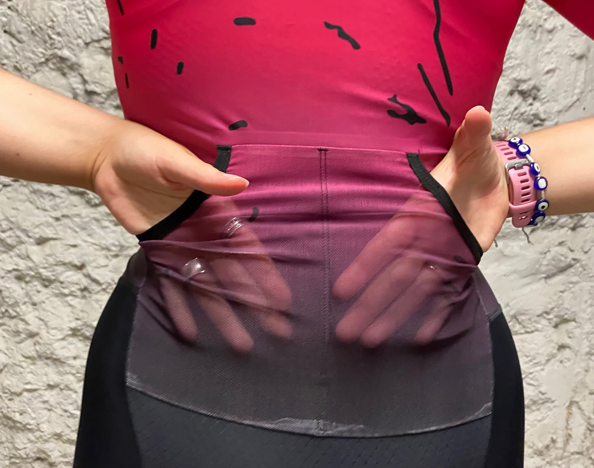 • Zadné vrecko – priestranné a ľahko dostupné; ideálne na gély či softflask. Je rozdelené prešitím na polovicu, takže si môžete pohodlne rozdeliť výživu a nemusíte hľadať po chrbte práve ten gél, ktorý potrebujete.