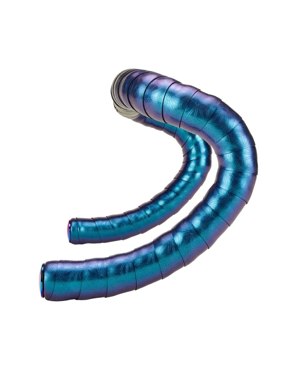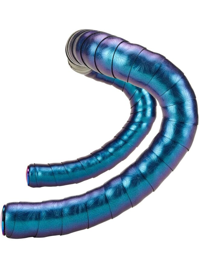 Supacaz Bling Handlebar Tape - Oil Slick je prémiová páska na řídítka s výrazným duhovým efektem "olejové skvrny", který mění barvy podle světla a dodává kolu velmi nápadný vzhled. Je vyrobena z kombinace PU vrchní vrstvy a Kush Foam pěnové/gelové vrstvy, která výrazně tlumí vibrace a zvyšuje jízdní komfort. Materiály jsou odolné vůči UV záření, potu a povětrnostním vlivům, takže zavinovačka si zachovává svůj vzhled i při intenzivním používání. Omotávka má délku cca 2160 mm, šířku 30 mm a tloušťku cca 3 mm, což poskytuje příjemný úchop i při dlouhých cestách. Balení obsahuje dvě role obalu, hliníkové koncovky Star Plugz a dokončovací pásku pro čistý a pevný povrch. Tento model, navržený tak, aby kombinoval odvážný styl s funkčností, dobrým odpružením a odolností, je oblíbený u jezdců, kteří chtějí kombinovat pohodlí a vizuální dopad.Detaily