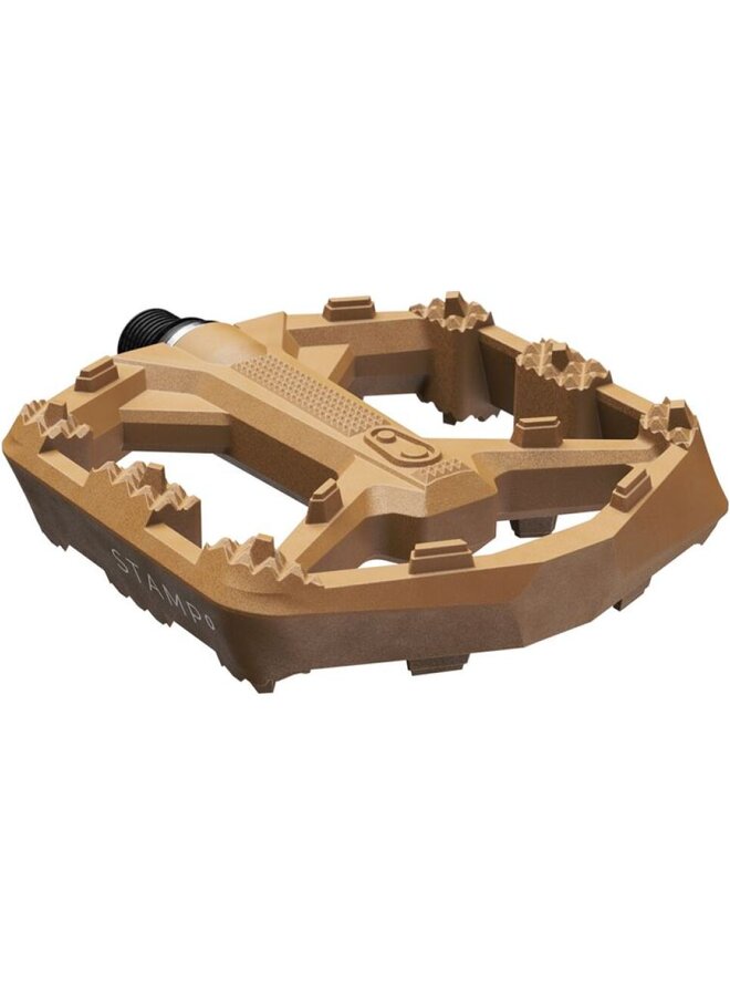 Model Stamp 0 přináší osvědčený tvar platformových pedálů Crankbrothers a spolehlivé vnitřní komponenty Stamp do zcela nového těla. Pedály Stamp 0 se vyznačují lehkým, ale odolným kompozitním tělem s minimálním profilem a konkávní platformou pro lepší kontrolu a stabilitu. 12 lisovaných pinů na každé straně je součástí těla platformy a poskytuje maximální přilnavost a jistotu a zároveň šetří podrážku vašich bot. Spolehlivá kluzná pouzdra Igus a kvalitní systém těsnění zaručují nerušené zážitky kilometr za kilometrem. Stejně jako všechny naše pedály Stamp je i Stamp 0 k dispozici v malé a velké velikosti. Platforma specifická pro danou velikost poskytuje všem jezdcům, ať už s malou nebo velkou nohou, optimalizované rozhraní pedálu. Jednoduše řečeno, větší přilnavost. To vše ve čtyřech barvách. Použití: trail/DJ/elektrokola/sport/commuting/dětská kola Tenký, konkávní profil - výška těla pedálu 13,5 mm až 15,5 mm Hmotnost 305g Tělo platformy: 102 x101 mm (boty 35 až 43,5), výška 13,5-15,5mm Platforma: nylon kompozitová Osa: kovaná Cr-Mo ocel Vnitřní ložisko: Igus LL kluzné pouzdro Vnější ložisko: Igus LL kluzné pouzdro Piny součástí těla pedálu, 12 kusů na každé straně pedálu Stamp Small doporučeno pro velikosti bot: 3-10 (US M) // 37-43,5 (EU) Stamp Large doporučeno pro velikosti bot: 10-15 (US M) // 43,5-49 (EU)Detaily