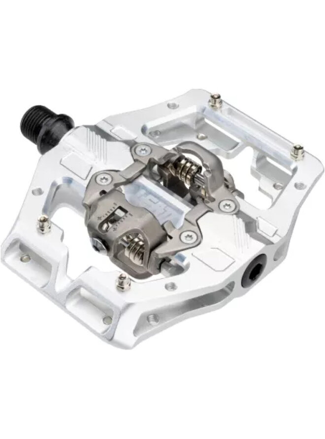 Tělo gravitačního pedálu bez klipů je vyrobeno z hliníku 6061-T6 kultivovaného CNC. Používá ultra-robustní kovanou a CNC kultivovanou ocelovou osu chrome-molybden. Plně obsluhovatelný systém trojitých ložisek se skládá ze samosprávného pouzdra LSL, ložiska jehly a průmyslového ložiska válce. Čtyřnásobná těsnění udržují vnitřní části suché za jakýchkoli podmínek. Dvoupodnikový klipový systém je kompatibilní s klasickými fotbalovými botami SPD. Retenční systém má nastavitelné pružinové napětí pro jemné a uvolnění a nabízí 5 stupňů volného pohybu. Velká platforma kolem klipového systému poskytuje solidní podporu pro optimalizované řízení a přenos energie. Pedál je testován a certifikován podle EFBE EPAC EPAC Gravity Tri-Test® (kategorie 5).