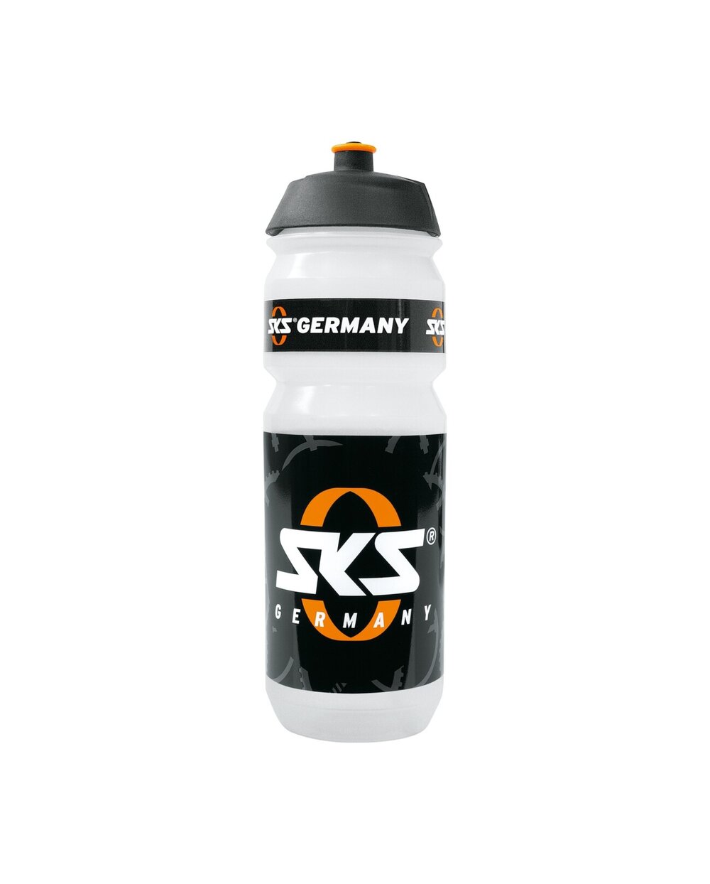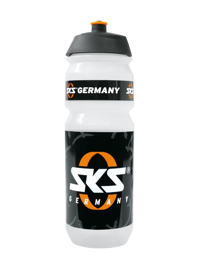 Čirá cyklistická láhev s černo-oranžovým vzorem SKS.