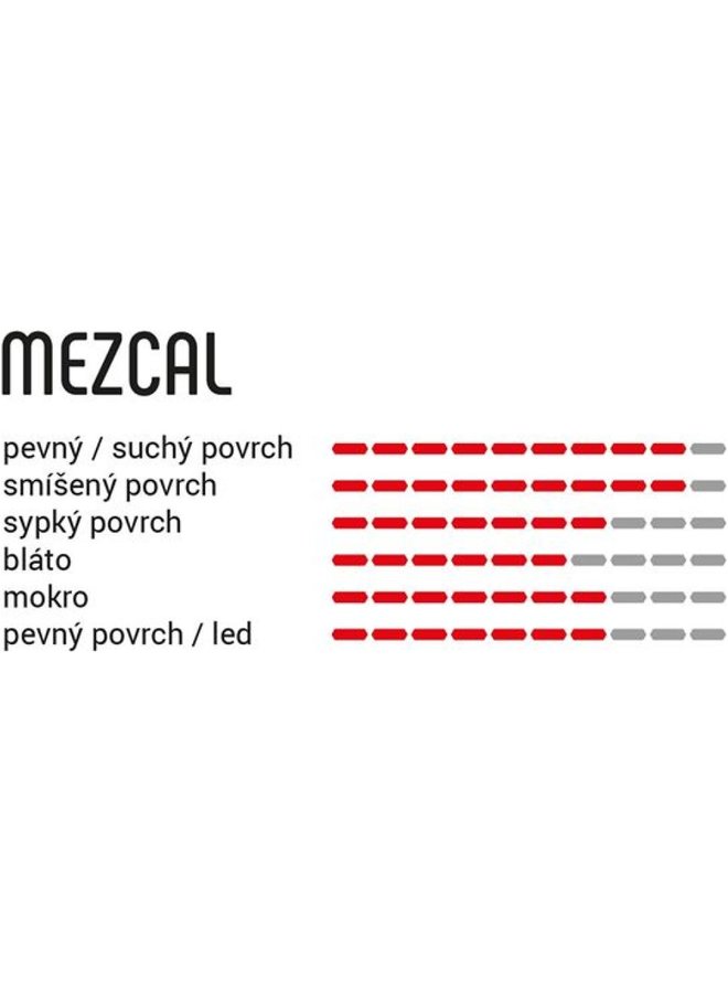 MEZCAL Velmi rychlý univerzální XC-TRAIL plášť Střední část vzorku tvoří na sebe téměř navazující knoby pro maximální rychlost. Jistotu v zatáčkách dodávají dostatečně ostré a vysoké knoby rozmístěné po stranách běhounu. Drátová patkaDetaily