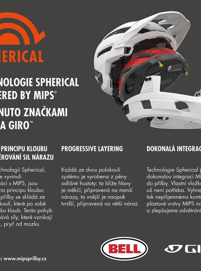 Přestože je značka Bell neoddiskutovatelným leaderem v oblasti přileb s odnímatelným chráničem brady, neustále se snažíme překonávat sami sebe. Model Super Air R není prostým faceliftem přilby Super 3R. Je to od základů nová přilba, která váží o neuvěřitelných 144 gramů méně. K tomu si přidejte výrazně lepší odvětrání, snadnější upínání pomocí dvou přezek (namísto tří) a inovativní technologii Spherical Powered by MIPS, která funguje jako jakési odpružení uvnitř přilby. Přilba se ve skutečnosti skládá ze dvou polokoulí: vnější z tvrdší EPS pěny a vnitřní z měkčí EPP pěny. Obě jsou spojeny pomocí žlutých elastomerů a kloužou po sobě podobně jako kloub. V případě nárazu se v nější polokoule okamžitě zastaví, zatímco vnitřní polokoule i s hlavou může pokračovat v pohybu, který pomalu tlumí elastomery. Prostě odpružení. MIPS (Multi-Directional Impact Protection System) poskytuje zvýšenou ochranu proti působení rotačních sil na hlavu. Více na www.MIP Sprilby.cz UPÍNACÍ SYSTÉM Float Fit KONSTRUKCE In-mold Polycarbonate Shell, Progressive Layering, odnímatelný chránič brady, Spherical Powered by MIPS VENTILACE 26 otvorů, Overbrow Ventilation odvětrání čela VLASTNOSTI lehké polstrování X-Static®, Sweat Guide, nastavitelný štítek, certifikace CE EN 1078, kompatibilita s motokrosovými brýlemi, úchyt na GoPro VELIKOSTI S (52–56 cm), M (55–59 cm), L (58–62 cm)Detaily