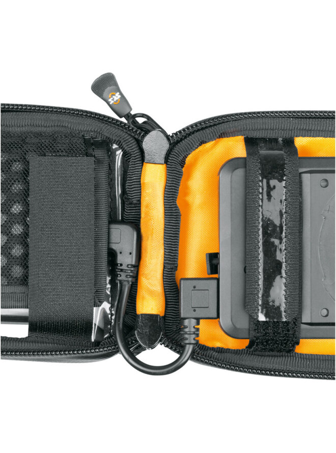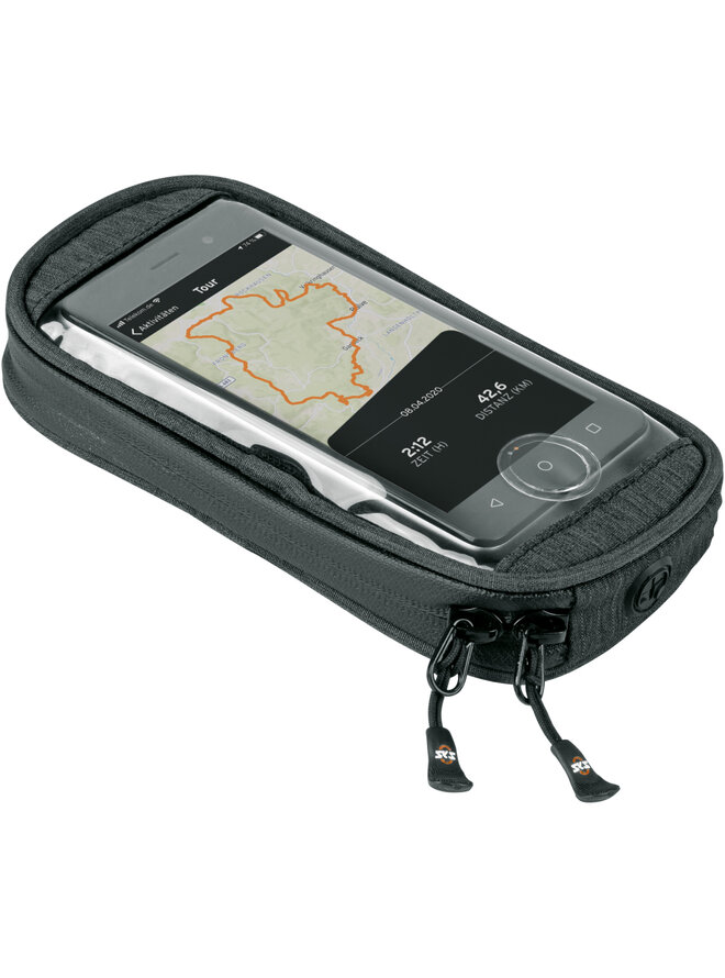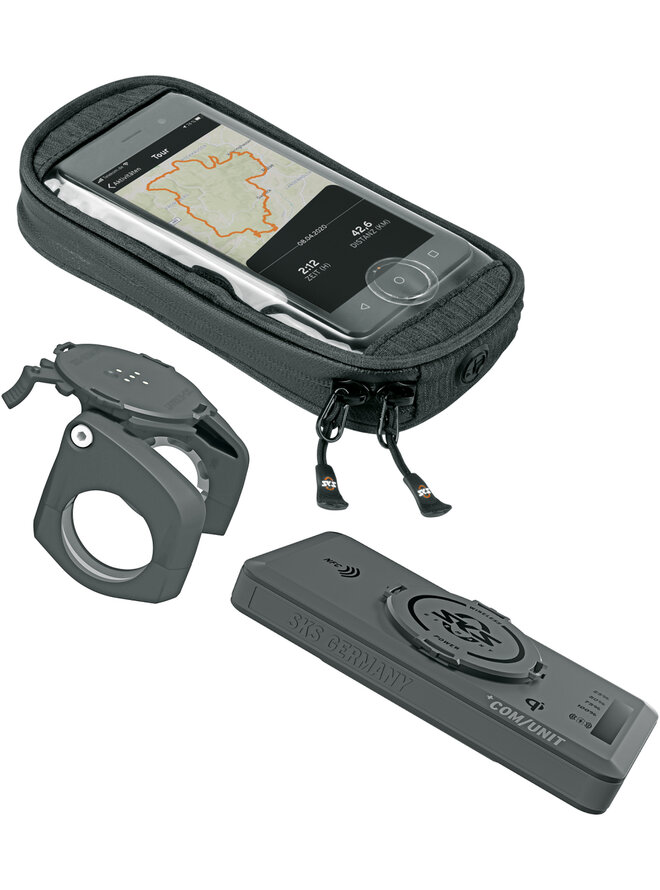 Na držák pak lze jediným otočením nasadit vodotěsné univerzální pouzdro na mobil COM/SMARTBAG (vhodné pro všechny běžné smartphony). Není tedy potřeba speciální kryt COMPIT. Průhledná fólie zajišťuje pohodlné ovládání dotykového displeje. Extra kapsa ve spodní části nabízí další prostor nejen pro klíče a peníze, ale také pro powerbanku COM/UNIT pro indukční nabíjení mobilního telefonu při jízdě na kole. Powerbanku lze také použít k nabíjení jiných zařízení pomocí přiloženého USB kabelu.