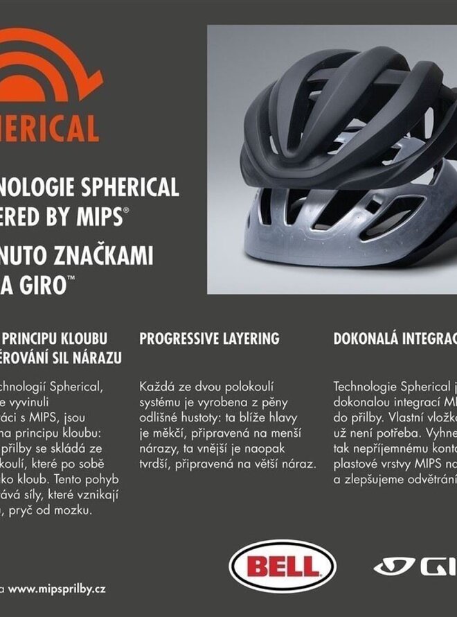 Lehčí, rychlejší, odvětranější. Aries Spherical je nejdokonalejší helma, jakou jsme kdy vyrobili. Profil jsme zmenšili na minimum, aby co nejlépe kopíroval siluetu hlavy. To spolu s nízkou hmotností a maximálním odvětráním pomocí 24 otvorů Wind Tunnel dává neuvěřitelné pohodlí při jízdě. Ale to hlavní se nachází uvnitř – Spherical Technology Powered by MIPS. Tato technologie je založena na principu kloubu. Skořepina se skládá ze dvou částí (polokoulí) vložených do sebe a spojených pomocí žlutých elastomerů. Celý systém vytváří jakési odpružení, které absorbuje síly v případě nárazu – polokoule se vůči sobě mohou pohnout a elastomery tlumí energii. Vnější skořepina je navíc vyrobena z tvrdšího materiálu, vnitřní je vyrobena z měkčího materiálu (technologie Progressive Layering). Celou přilbou navíc prochází speciální výztuha Aura Reinforcement Arch. Usazení na hlavě zajišťuje patentovaný upínací systém Roc Loc 5+ Air spolu s antimikrobiálními výstelkami Ionic+. MIPS (Multi-Directional Impact Protection System) poskytuje zvýšenou ochranu proti působení rotačních sil na hlavu. UPÍNACÍ SYSTÉM Roc Loc® 5+ Air KONSTRUKCE In-mold, Progressive Layering, Spherical Powered by MIPS, zpevňující oblouk Aura, Nanobead EPS VENTILACE 24 otvory, Wind Tunnel™ VLASTNOSTI antibakteriální výstelky Ionic+, ultralehké pásky Slimline VELIKOSTI Super Fit™ S (51–55 cm), M (55–59 cm), L (59–63 cm)Detaily