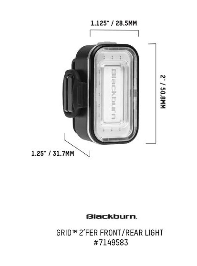 Grid 2’FER je vysoce výkonná přední a zároveň zadní blikačka. Dvojitým kliknutím spínacího tlačítka si vyberete barvu světla: bílou (přední) nebo červenou (zadní). Je vybavena celkem čtyřmi módy, ze kterých si jistě vyberete ten správný pro danou příležitost podle toho, zda potřebujete vyšší výkon, nebo delší výdrž. Každopádně s maximálním výkonem 175 lumenů (přední) nebo 55 lumenů (zadní) vás na silnici nikdo nepřehlédne. Technologie COB (Chip on Board) je to nejmodernější a nejefektivnější řešení. Světlo se přidělává snadno pomocí silikonového pásku nebo pomocí odjímatelného klipu. Dobíjení probíhá pomocí USB-C kabelu. Ochrana proti vodě IP-65. MÓDY PŘEDNÍ High 2h (175 lumenů) • Pulse 6h (100 lumenů) +2h Auto-Eco dojezdový mód • Fast Strobe 7h (40 lumenů) +2h Auto-Eco dojezdový mód • ECO Flash 25h (40 lumenů) MÓDY ZADNÍ High 1,75h (55 lumenů) • Pulse 6h (35 lumenů) +2h Auto-Eco dojezdový mód • Fast Strobe 6,5h (20 lumenů) +2h Auto-Eco dojezdový mód • ECO Flash 22h (20 lumenů)Detaily
