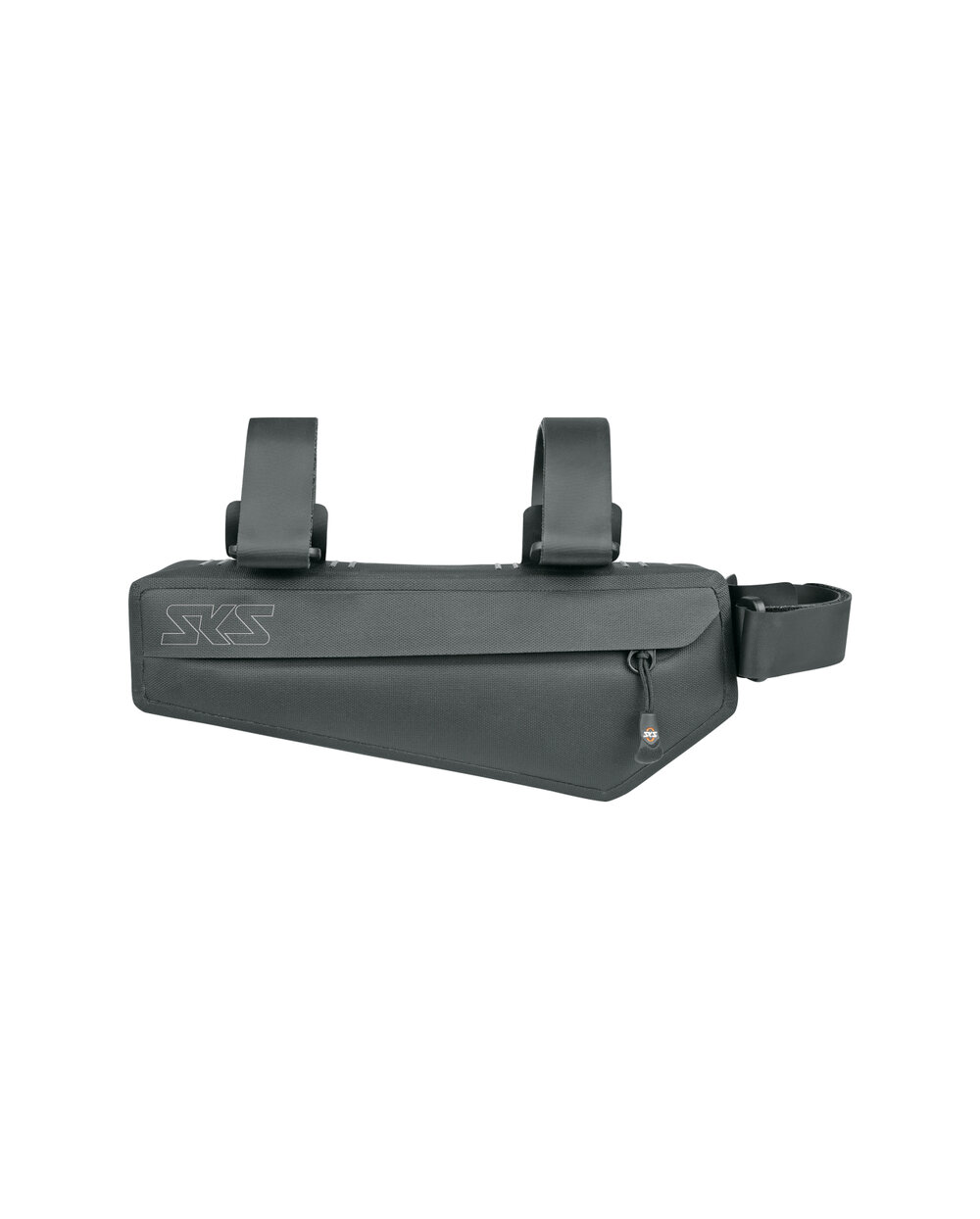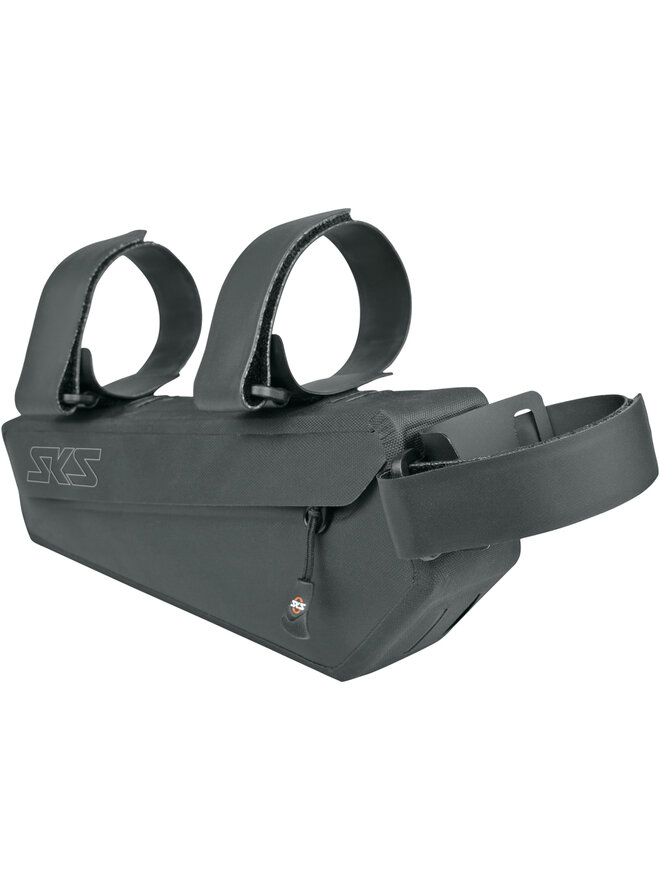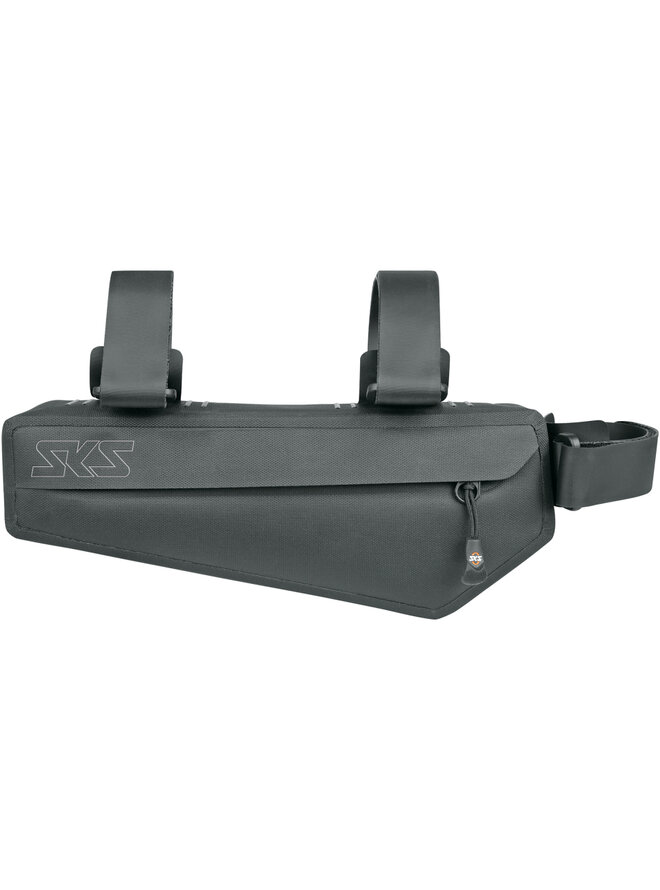 Lahve na pití se díky úzkému designu tašky SKS snadno vejdou do trojúhelníku rámu. Tašku lze bezpečně upevnit na rám kola nebo sedlovku pomocí extra dlouhého protiskluzového suchého zipu s ochranou rámu. Dá se namontovat i na aero sedlovky, přičemž háčky a suchý zip lze zkrátit a vyměnit. Pogumovaná horní část brašny chrání lak a poskytuje oporu na všech cestách.