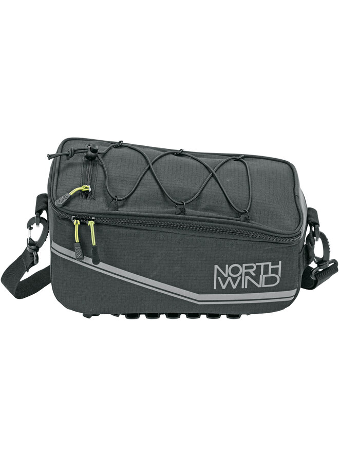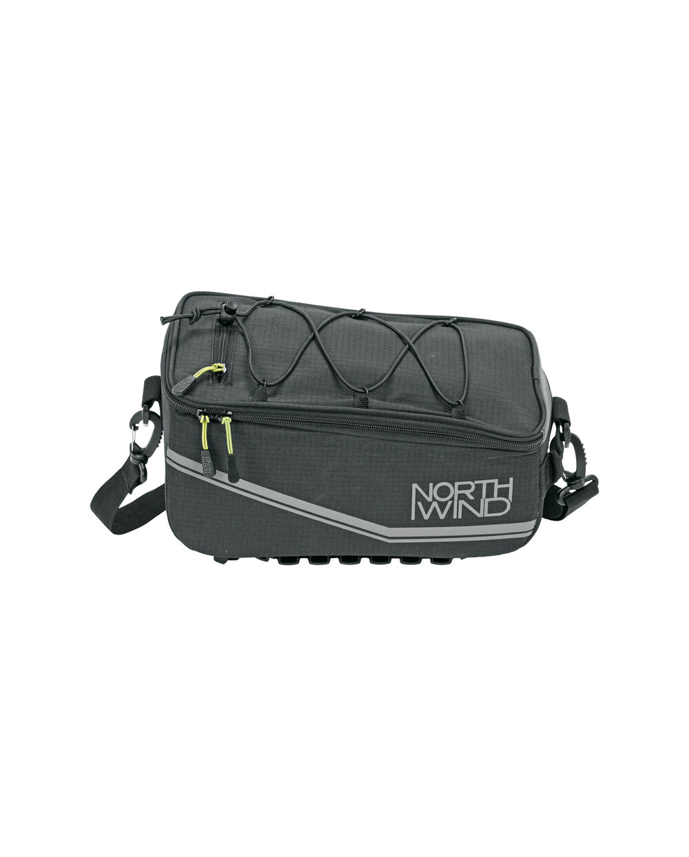 Taška s prostornou hlavní přihrádkou. Úložná kapsa z elastické síťoviny umožňuje převážet další zavazadla. Pláštěnka udrží tašku i její obsah v suchu, zatímco reflexní prvky na voděodpudivé nylonové tkanině zajistí viditelnost i ve tmě.