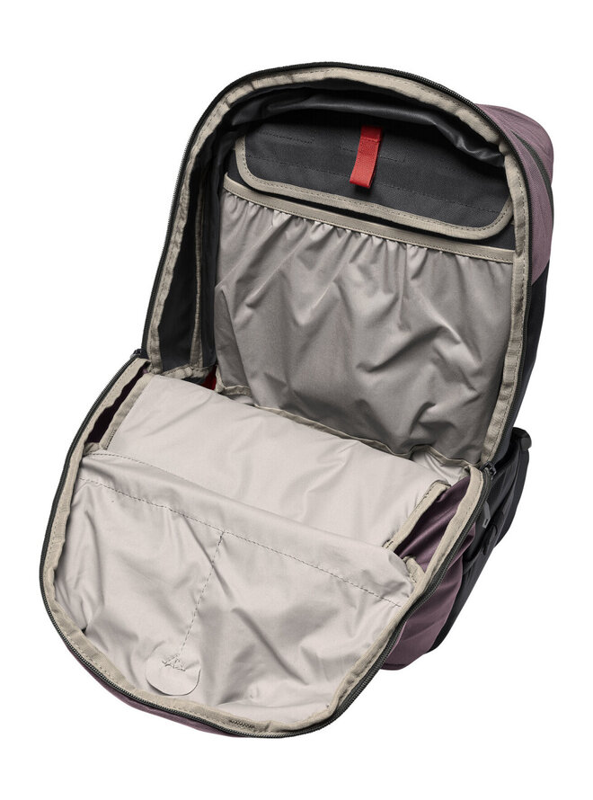 - Přední spodní komora, horní kapsa s organizátorem sítě, velký přední kompartment oddělený od menších, bočních protahovacích kompartmentů, držáku helmy, světla a také zahrnuje pláštěnku