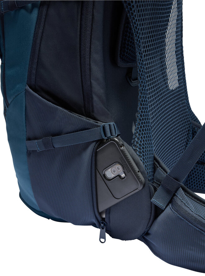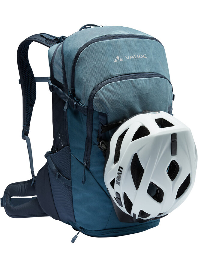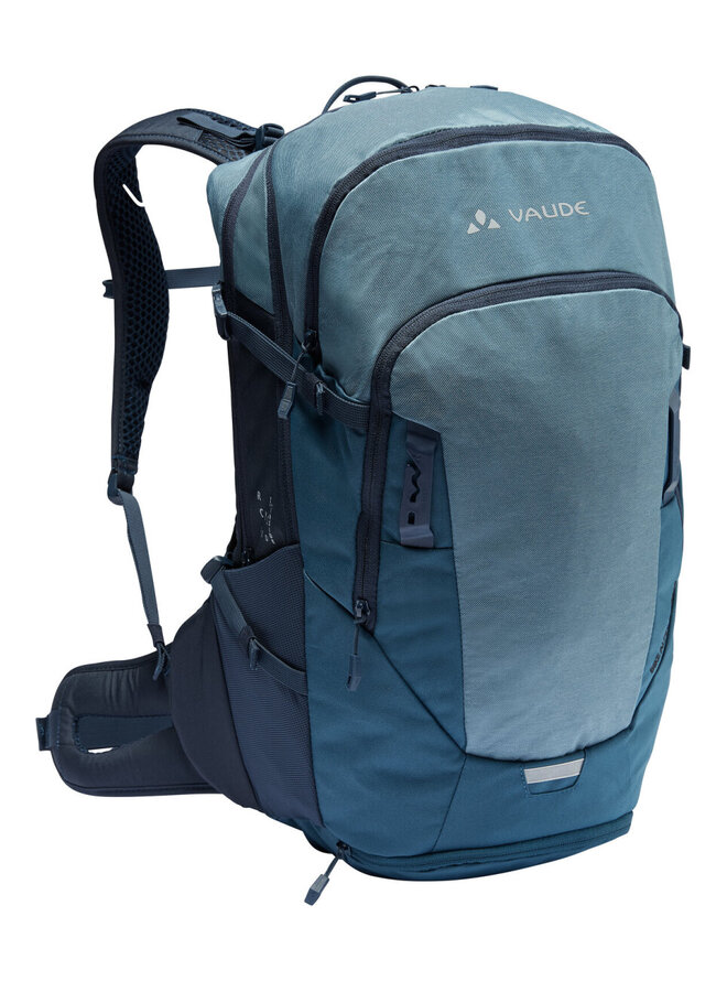 - Přední spodní komora, horní kapsa s organizátorem sítě, velký přední kompartment oddělený od menších, bočních protahovacích kompartmentů, držáku helmy, světla a také zahrnuje pláštěnku
