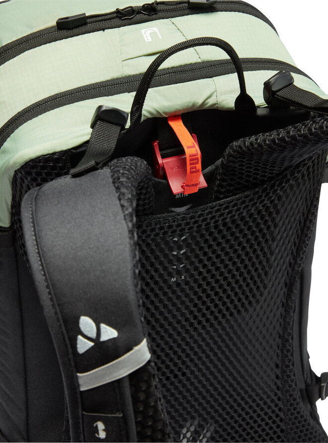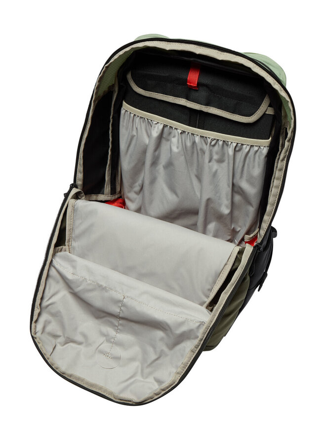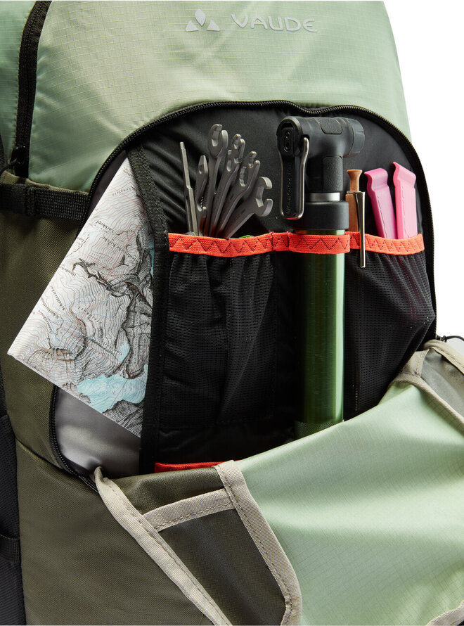 - Přední komora, horní kapsa s organizátorem sítě, velký přední kompartment oddělený od menších bočních vnějších kapes, přilby a držáku světla, zahrnuje pláštěnku