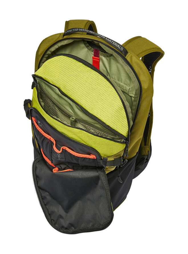 - Před hlavním kompartmentem je vnitřní kapsa na zip, kompartment nástrojů, držák přilby, pravé křídlo bederního pásu, oční natahovací kapsy, samostatný kompartment zvlhčovače, kompresní popruhy po stranách, sluneční popruh, pláštěnka v samostatném dolním kompartmentu a reflexivní