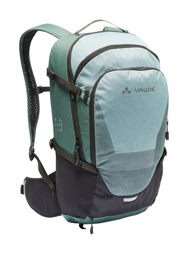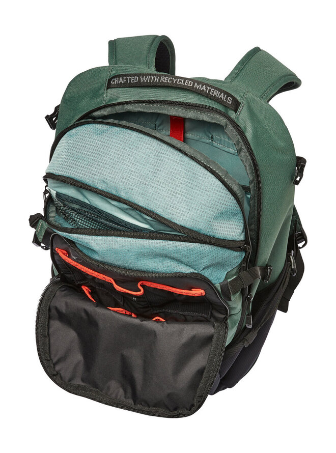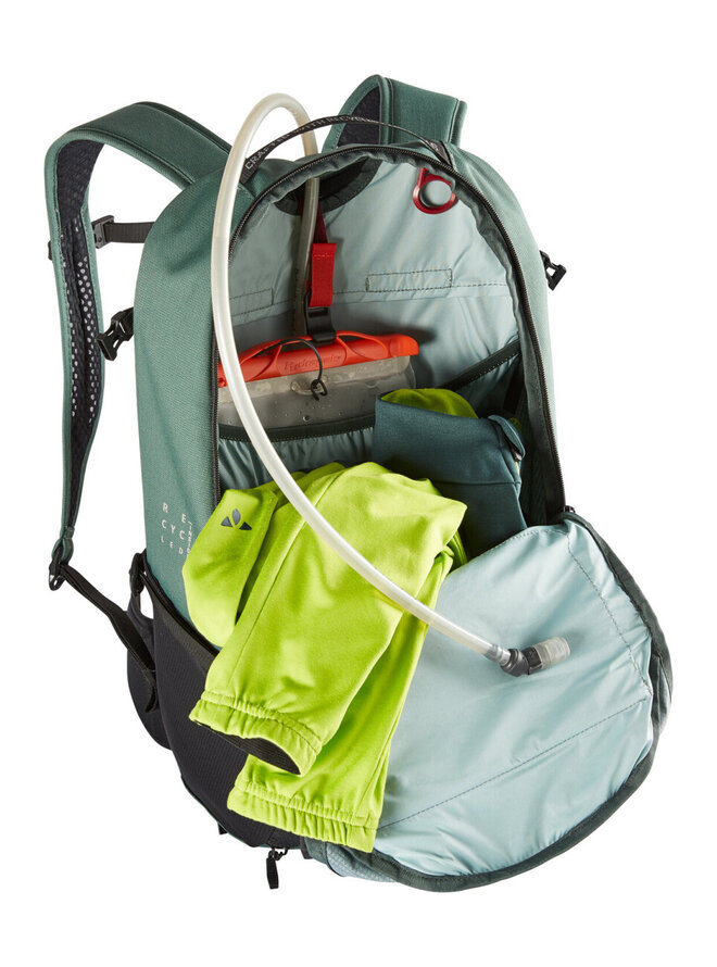 - Před hlavním kompartmentem je vnitřní kapsa na zip, kompartment nástrojů, držák přilby, pravé křídlo bederního pásu, oční natahovací kapsy, samostatný kompartment zvlhčovače, kompresní popruhy po stranách, sluneční popruh, pláštěnka v samostatném dolním kompartmentu a reflexivní