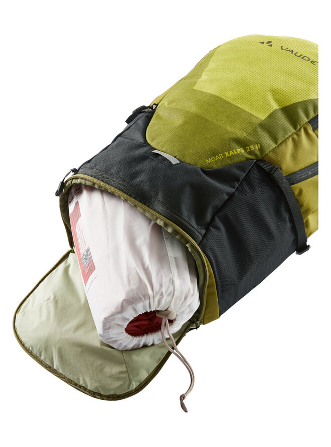 - Batoh je rozdělen do tří oddílů. Velký hlavní kompartment lze rozdělit pro lepší organizaci oblečení a jídla a nabízí samostatný přístup od výše nebo dole, před ním je dalším oddílem pro brýle nebo peněženku, vpředu, pod ním je místo pro mapy nebo jiné dokumenty, má také skrytý kompartment s držákem helmy