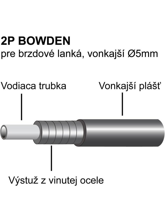 Bowden 2P pro brzdová lanka s teflonem potaženým vnitřním lankem. Nízké vnitřní tření snižuje sílu potřebnou k brzdění. Vnější průměr 5 mm. 50 m v balení.Detaily