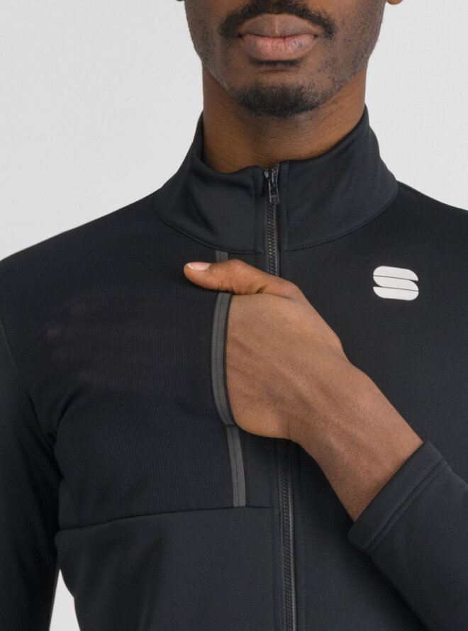 - Záda bundy a podpaží jsou vyrobeny z elastické česané tkaniny, která zaručuje optimální volnost pohybu a zároveň účinně odvádí přebytečné teplo a pot. Tento materiál přispívá k regulaci tělesné teploty, čímž zabraňuje přehřívání i při vysokorychlostní jízdě.