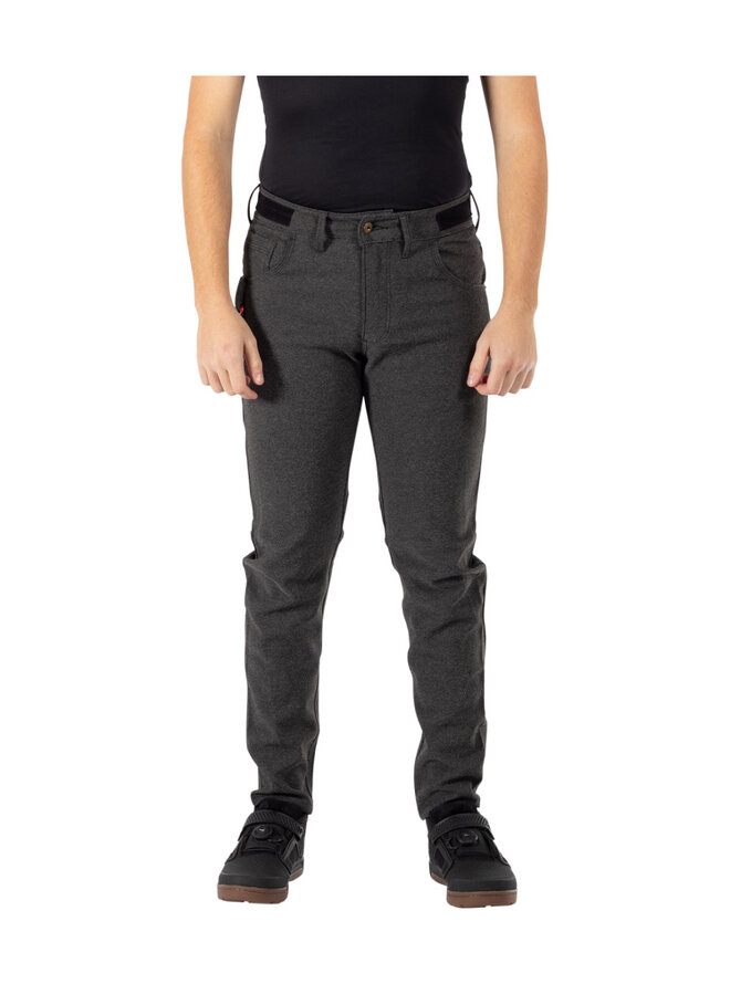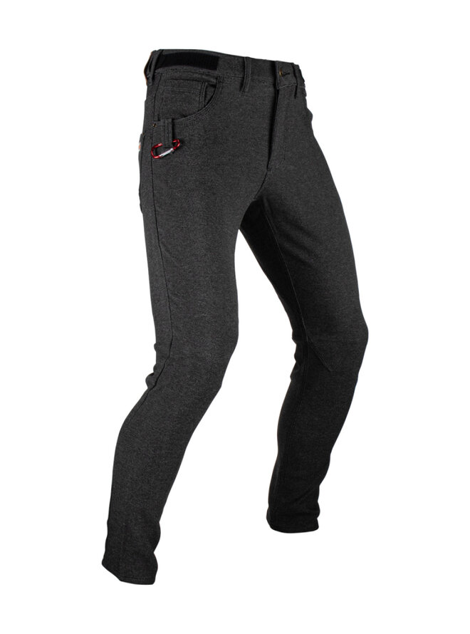 Pásek v pase na suchý zip umožňuje vyladit střih. Kalhoty Gravity 3.0 s knoflíky na džínách a aplikacemi z veganské kůže jsou ideální pro jízdu na ulici.