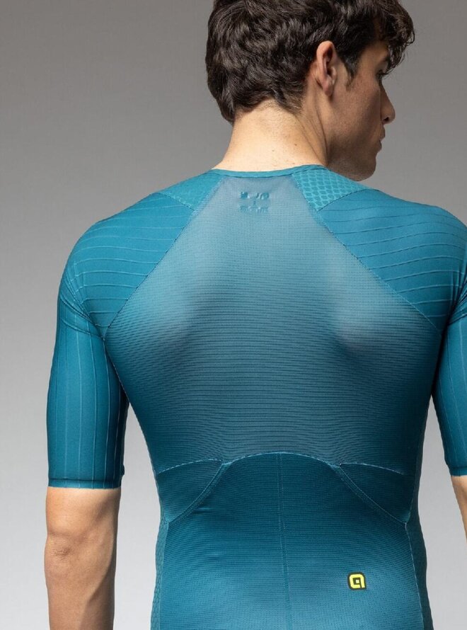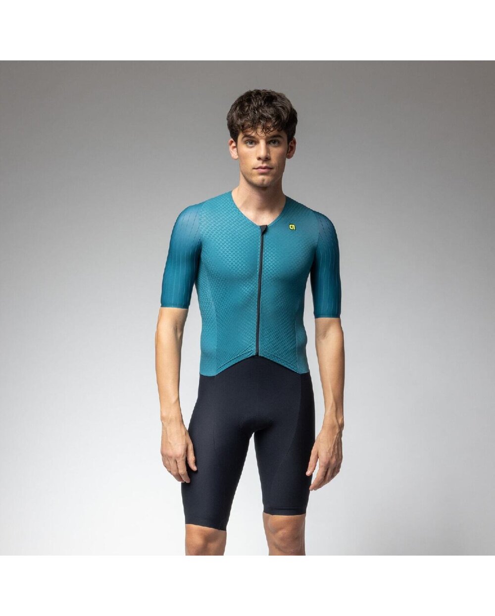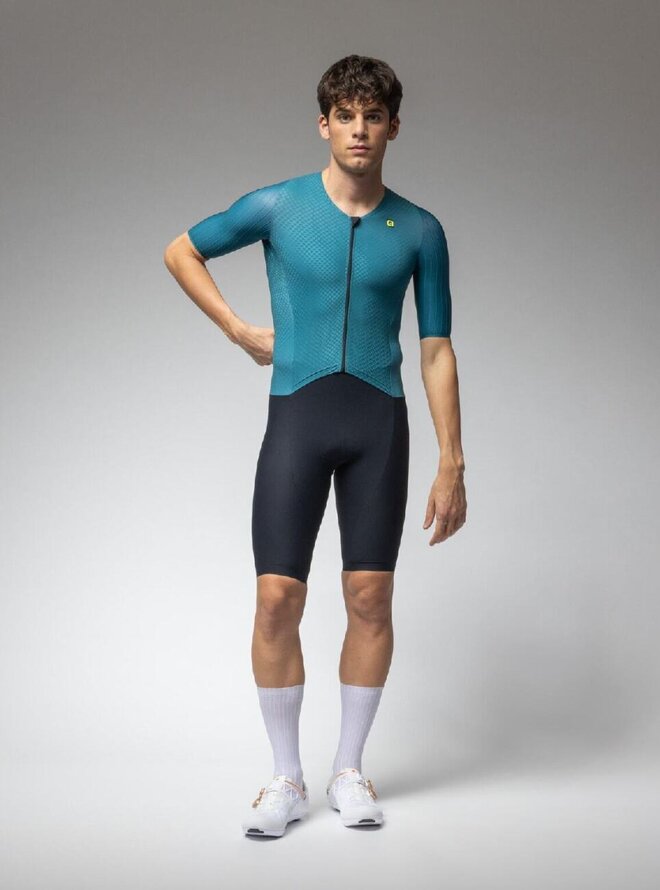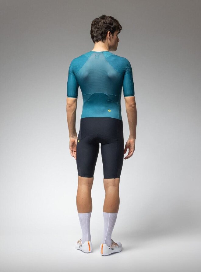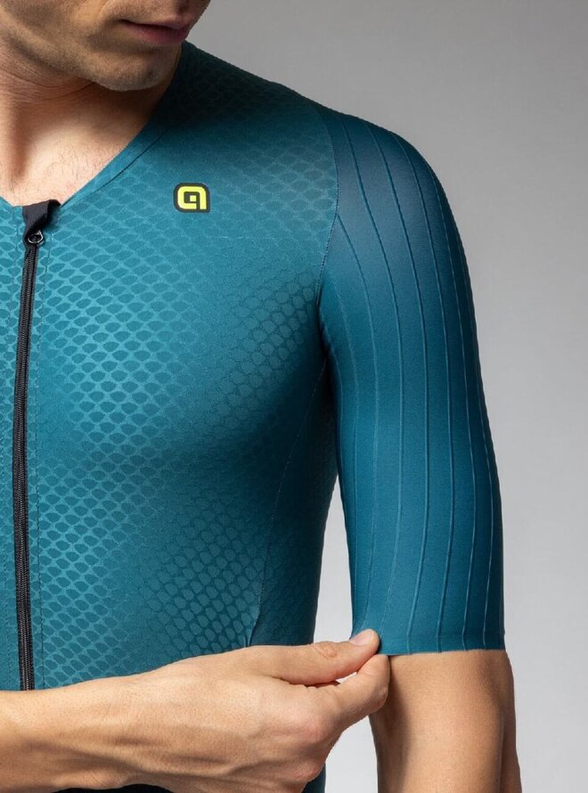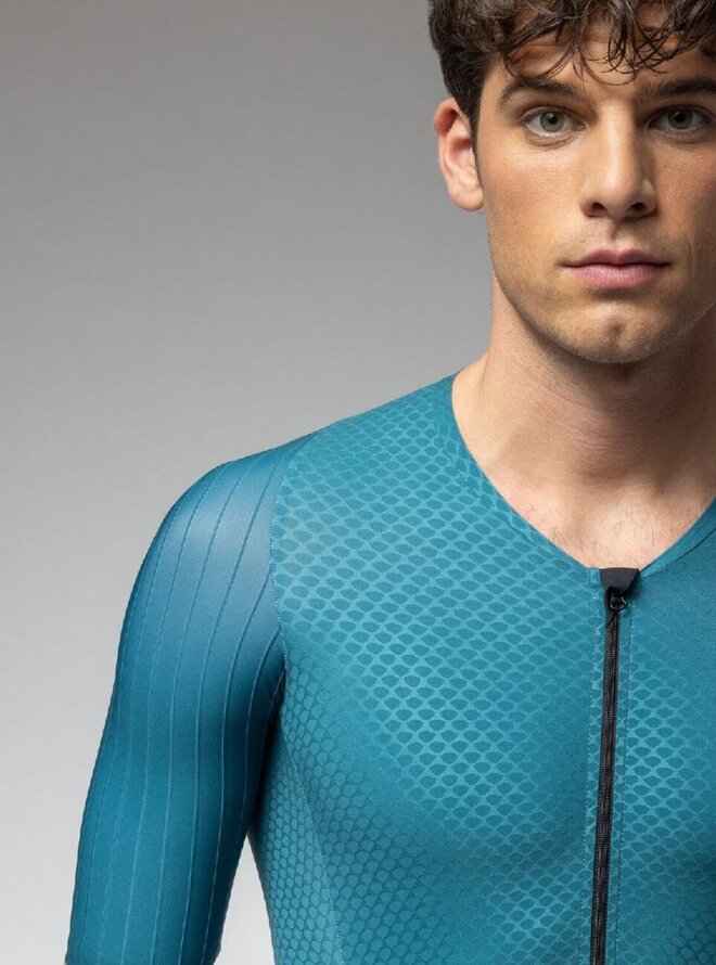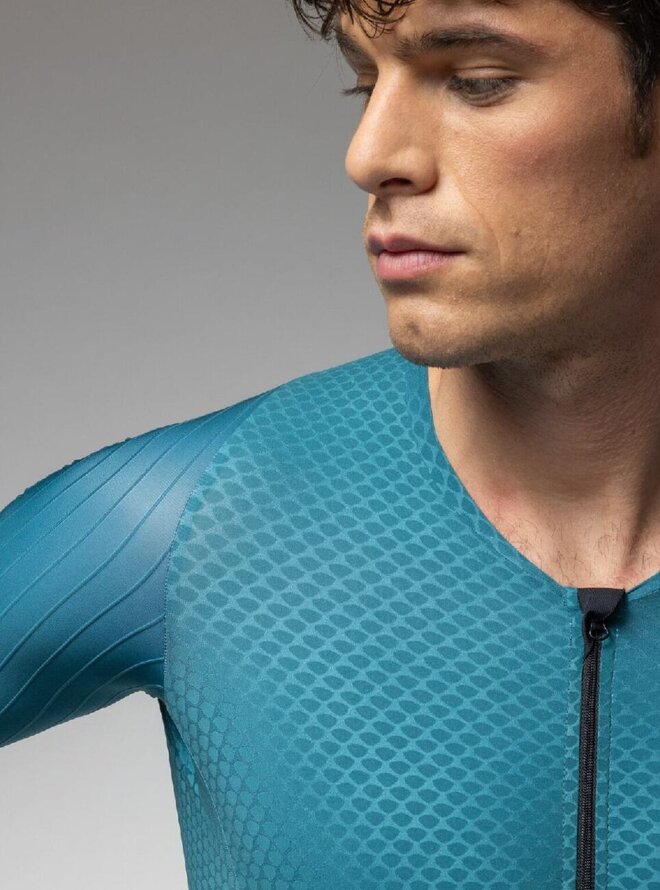 Rukávy s raw-cut zakončením z 3D strukturované tkaniny s kanálky podporují plynulý pohyb a optimální proudění vzduchu. Kalhotová část s minimem švů zajišťuje účinnou kompresi, stabilitu a spolehlivou svalovou oporu po celou dobu závodu.