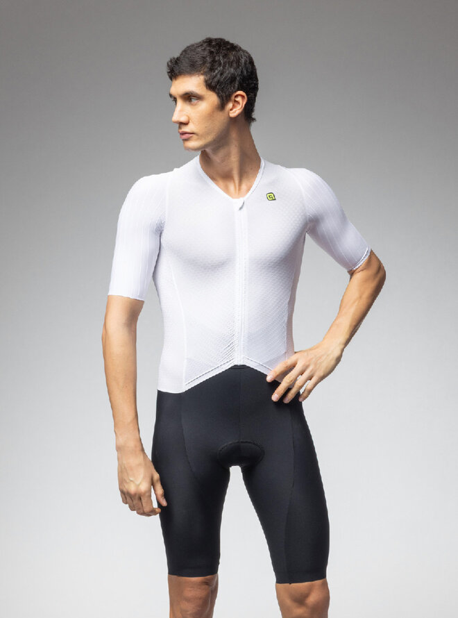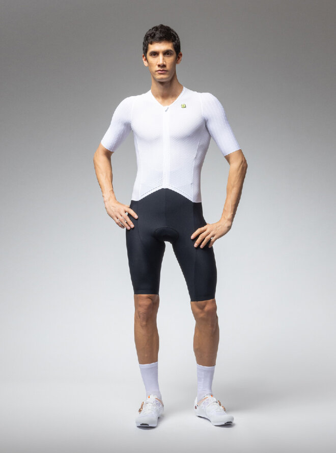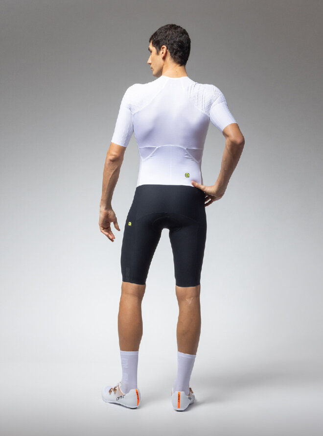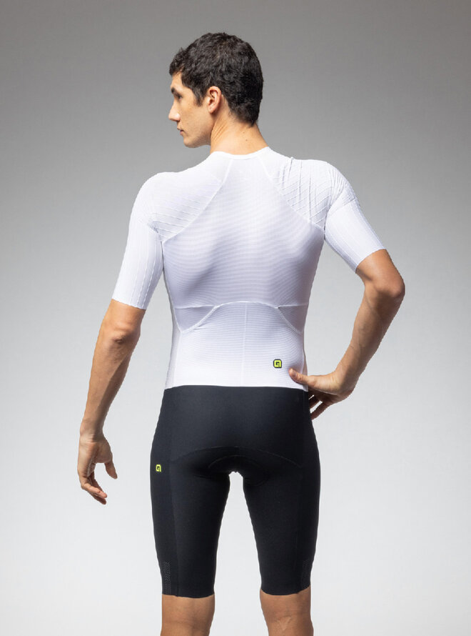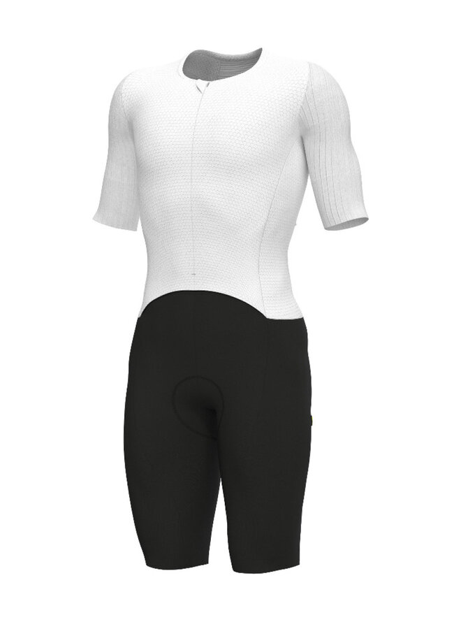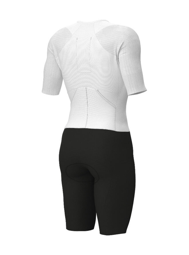 Rukávy s raw-cut zakončením z 3D strukturované tkaniny s kanálky podporují plynulý pohyb a optimální proudění vzduchu. Kalhotová část s minimem švů zajišťuje účinnou kompresi, stabilitu a spolehlivou svalovou oporu po celou dobu závodu.