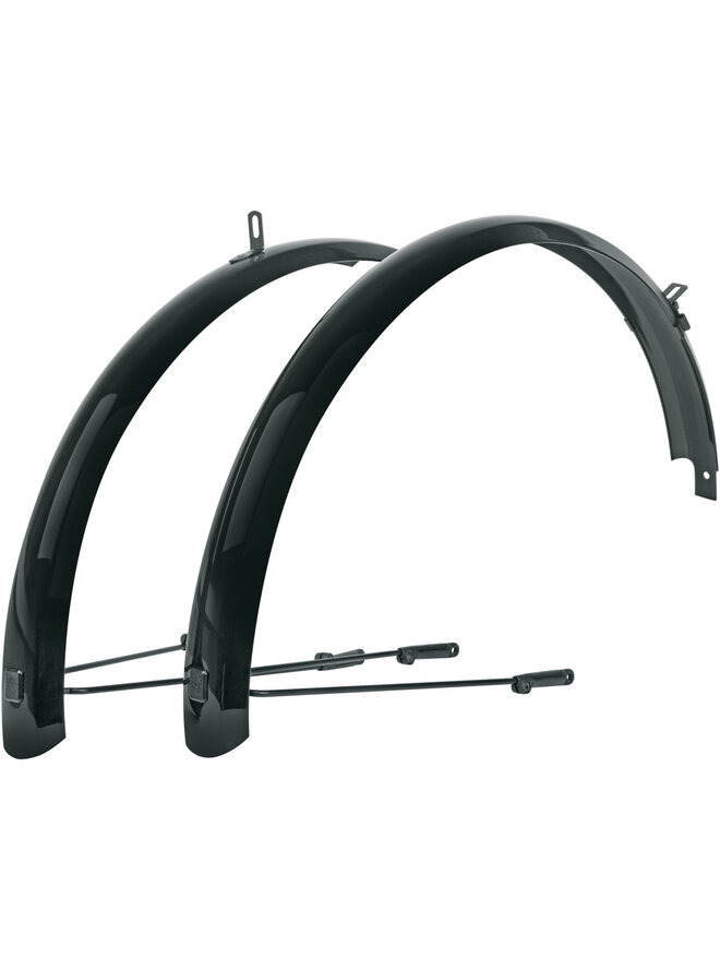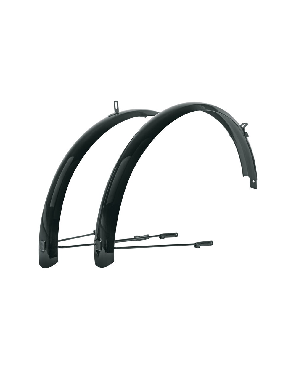 SKS Bluemels Basic je sada blatníků z robustní sendvičové konstrukce. Jejich lesklé provedení dokáže zaujmout, spolehlivě ochrání před nečistotami a stříkající vodou. Díky flexibilní sendvičové konstrukci, ve které jsou ultrajemné hliníkové lišty zapuštěny do plastového povlaku, jsou blatníky extrémně robustní, tuhé a odolné vůči korozi. Slouží jako vynikající ochrana díky montáži v blízkosti krytu. Ať už na polních nebo lesních cestách, blatníky BLUEMELS Basic nabízejí vynikající všestrannou ochranu. Bezpečnostní systém ESC odpojí vzpěry, pokud se mezi paprsky kola zachytí větve, aby se kolo nemohlo zaseknout.