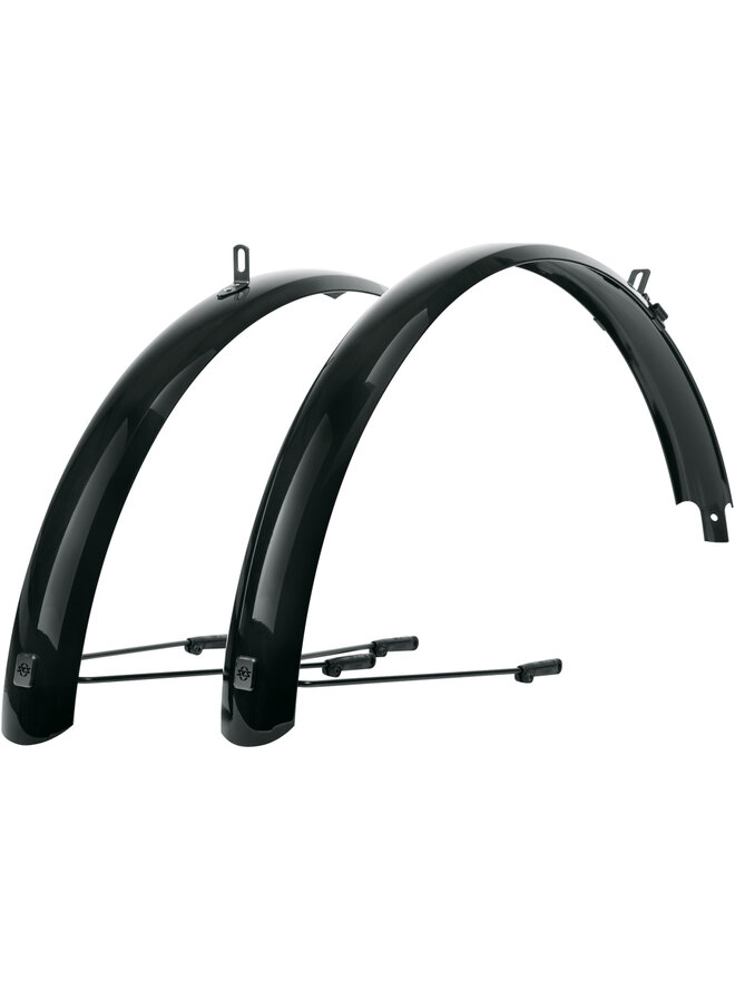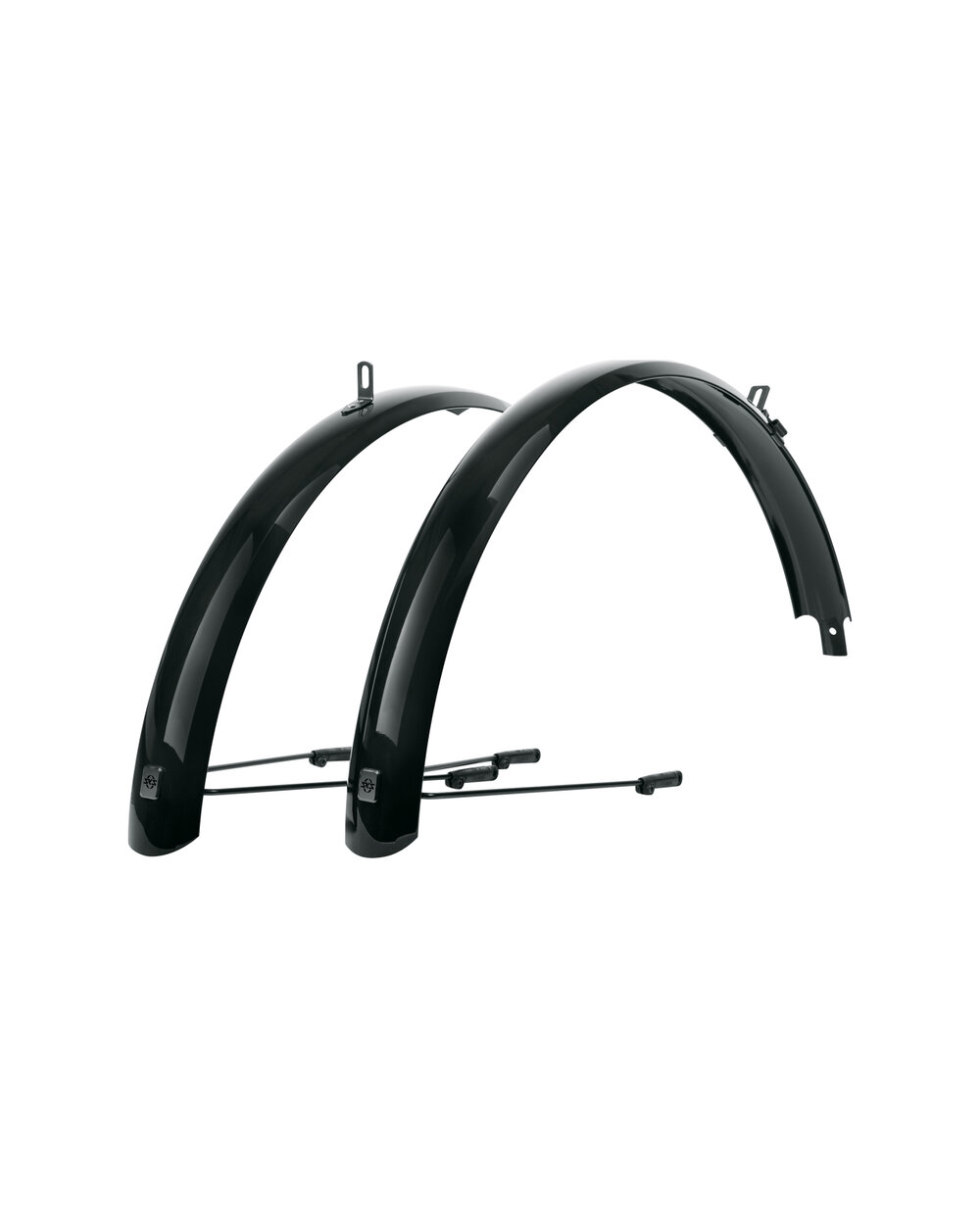 SKS Bluemels Basic je sada blatníků z robustní sendvičové konstrukce. Jejich lesklé provedení dokáže zaujmout, spolehlivě ochrání před nečistotami a stříkající vodou. Díky flexibilní sendvičové konstrukci, ve které jsou ultrajemné hliníkové lišty zapuštěny do plastového povlaku, jsou blatníky extrémně robustní, tuhé a odolné vůči korozi. Slouží jako vynikající ochrana díky jejich montáži blízko krytu. Ať už na polních nebo lesních cestách, blatníky BLUEMELS Basic nabízejí vynikající všestrannou ochranu. Bezpečnostní systém ESC odpojí vzpěry, pokud se mezi paprsky kola zachytí větve, aby se kolo nemohlo zaseknout.