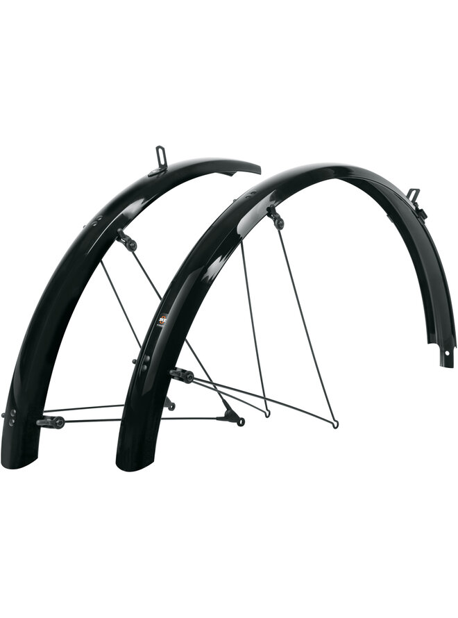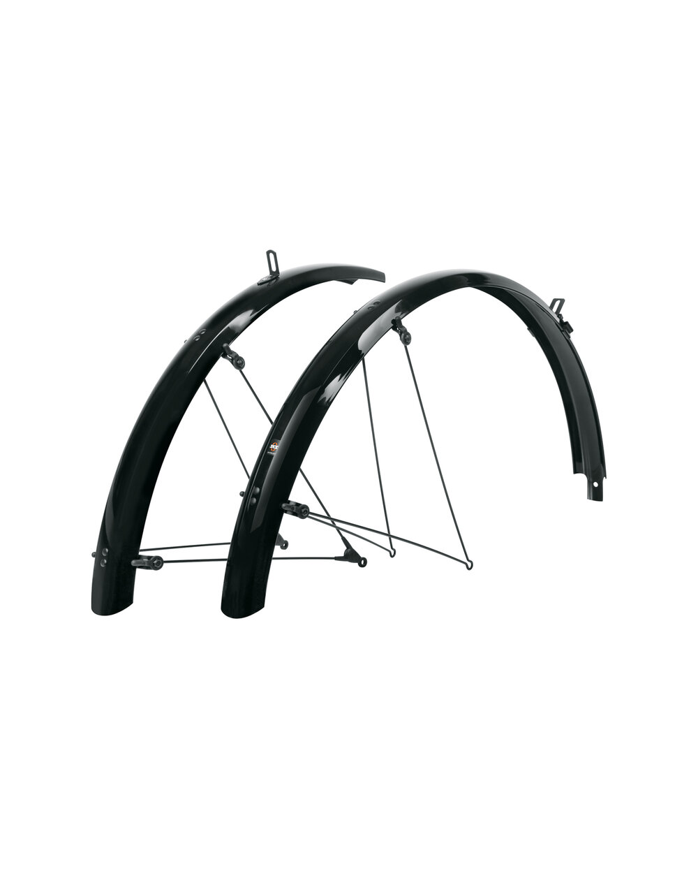 SKS Bluemels Basic je sada blatníků z robustní sendvičové konstrukce. Jejich lesklé provedení dokáže zaujmout, spolehlivě ochrání před nečistotami a stříkající vodou. Díky flexibilní sendvičové konstrukci, ve které jsou ultrajemné hliníkové lišty zapuštěny do plastového povlaku, jsou blatníky extrémně robustní, tuhé a odolné vůči korozi. Slouží jako vynikající ochrana díky montáži v blízkosti krytu. Ať už na polních nebo lesních cestách, blatníky BLUEMELS Basic nabízejí vynikající všestrannou ochranu. Bezpečnostní systém ESC odpojí vzpěry, pokud se mezi paprsky kola zachytí větve, aby se kolo nemohlo zaseknout.