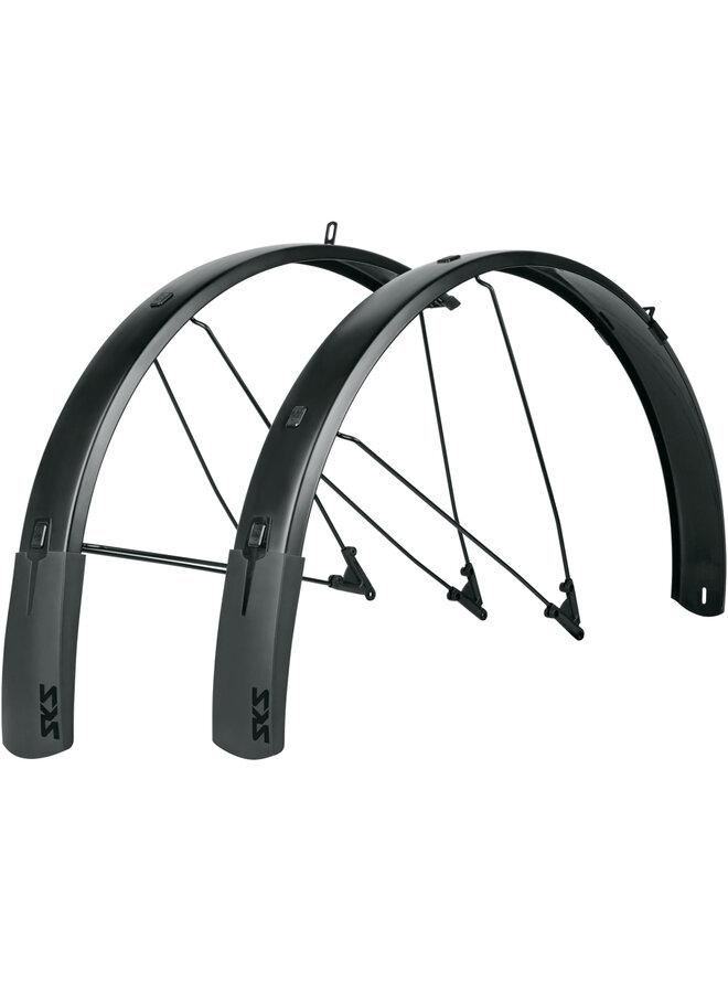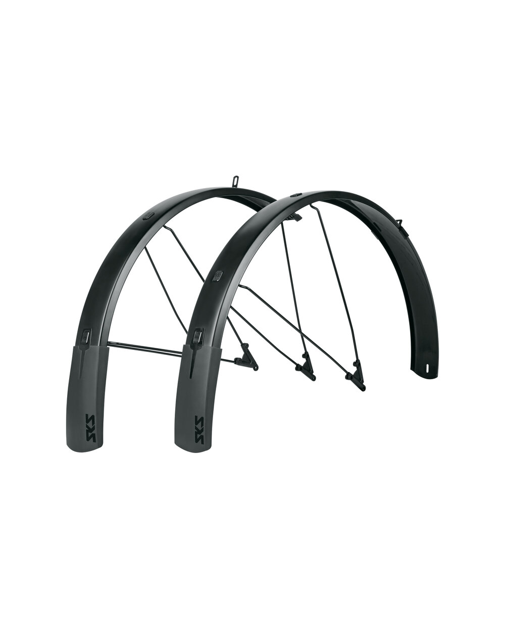 Sada blatníků s pružným spoilerem. Blatníky nemohou být delší: Sada blatníků BLUEMELS STYLE s flexibilním spoilerem nabízí vynikající všestrannou ochranu proti stříkající vodě. Díky flexibilní sendvičové konstrukci, ve které jsou ultrajemné hliníkové proužky zasazeny do plastového povlaku, je blatník extrémně robustní, pevný a odolný vůči korozi. Nový V-adaptér s bezpečnostním systémem ESCS v černé matné úpravě a s černými spojovacími prvky dodává BLUEMELS STYLE jednotný design a vyniká i vzhledem. Nově vyvinutý V-adaptér s bezpečnostním systémem ESC odpojí dvojitá U-ramena, pokud se větve zachytí mezi paprsky, takže se kolo nezasekne. Včetně příslušenství a držáků.