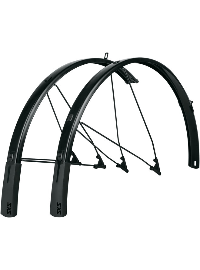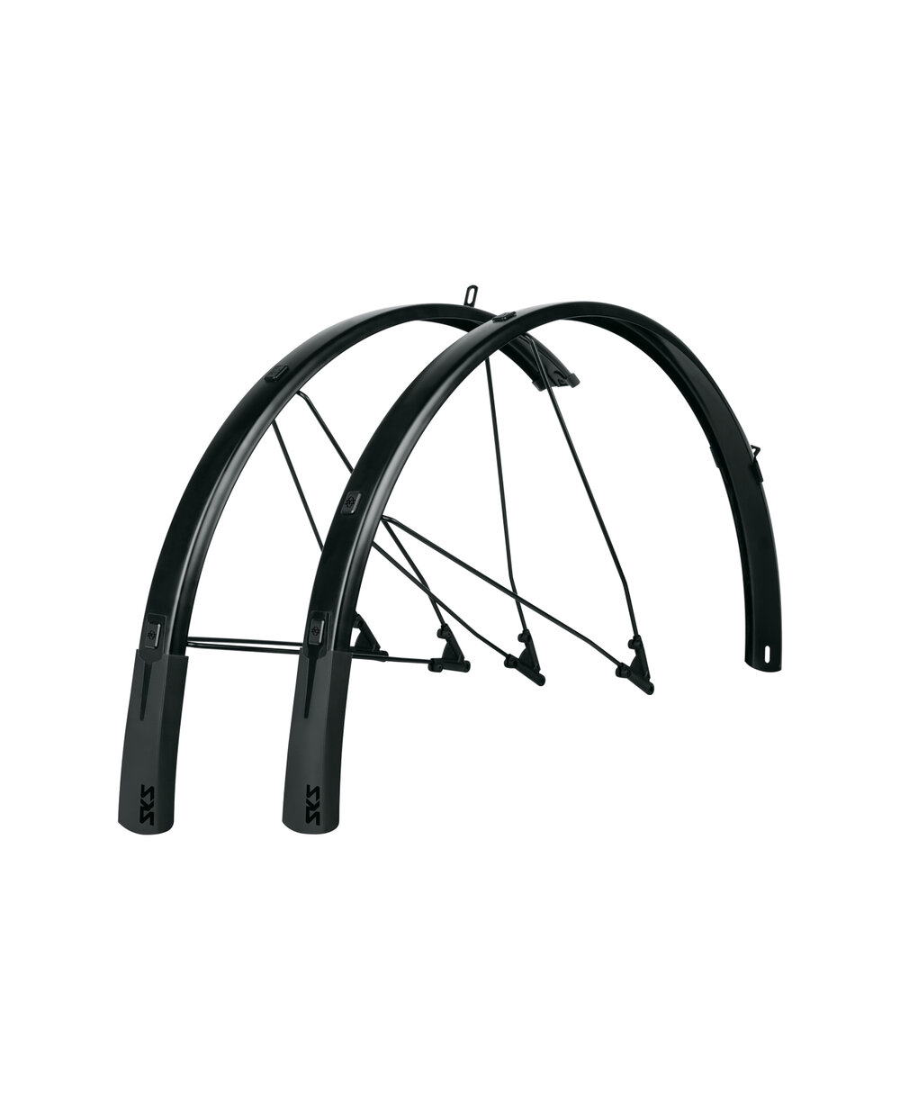 SKS Bluemels Style je sada blatníků s flexibilním spoilerem, který nabízí vynikající všestrannou ochranu proti stříkající vodě. Díky flexibilní sendvičové konstrukci, ve které jsou ultrajemné hliníkové lišty zapuštěny do plastového povlaku, je blatník extrémně robustní, tuhý a odolný vůči korozi. Model má nový V-adaptér s bezpečnostním systémem ESC, který odpojí dvojité U-vzpěry, pokud se mezi hroty zachytí větve. To by mělo zabránit zadření kola. S matným černým povrchem a černými upevňovacími prvky mají blatníky jednotný design a vynikají také vzhledem.