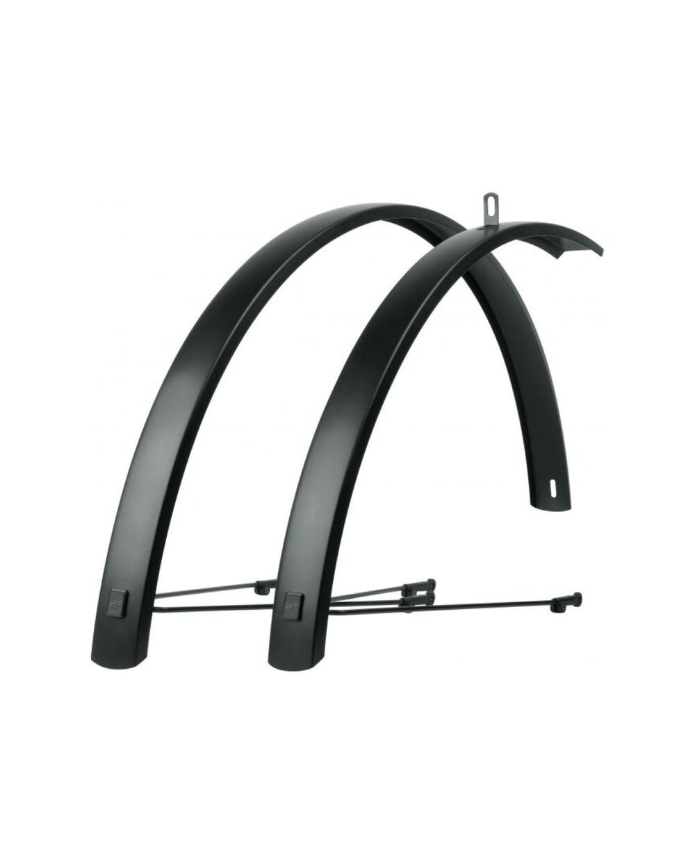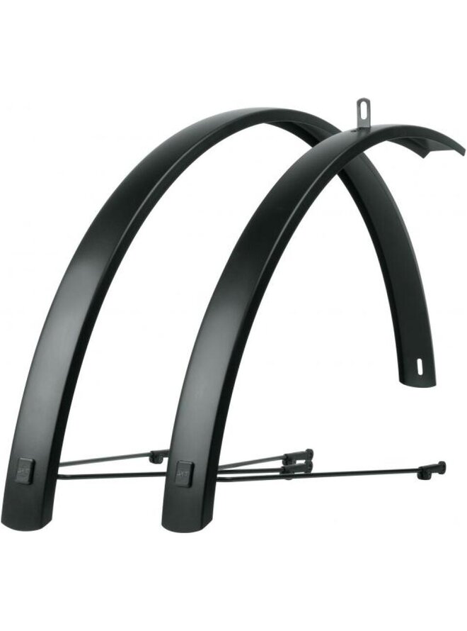 Stylové hliníkové blatníky SKS Edge AL 56 jsou ideální volbou pro krosová a trekingová kola s průměrem kol 28 palců. Díky minimalistickému designu a matné černé povrchové úpravě se téměř neviditelně integrují do rámu kola a zlepšují jeho celkový vzhled. Blatníky poskytují vynikající ochranu proti stříkající vodě a nečistotám, jejich robustní hliníková konstrukce zajišťuje vysokou stabilitu i při tříbodovém zapínání. Přední blatník je dlouhý 740 mm, zadní 1200 mm a jsou kompatibilní s pneumatikami o maximální šířce 50 mm. Celková hmotnost setu je 568 g. Tyto blatníky jsou vyrobeny v Německu, což zaručuje jejich vysokou kvalitu a precizní zpracování.