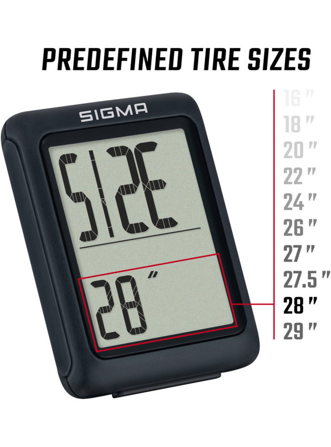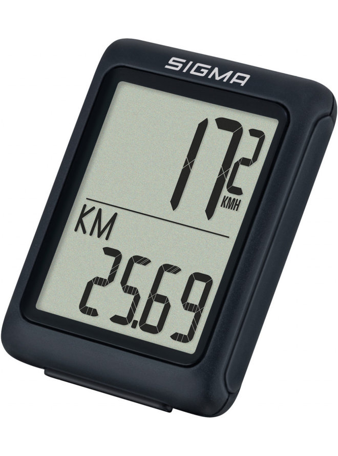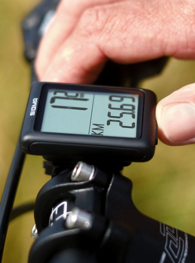 Tento nejmenší cyklocomputer SIGMA je kompaktní a zobrazuje pět nejdůležitějších základních funkcí, které mají cyklisté rádi na očích: rychlost, denní kilometry, celkový počet ujetých kilometrů, čas jízdy a hodiny.