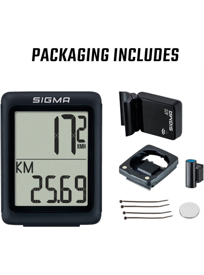 Cyklocomputer (včetně baterie), držák pro bezdrátový model, vysílač ATS (včetně baterie), magnet, upevňovací materiál, návod k použití.