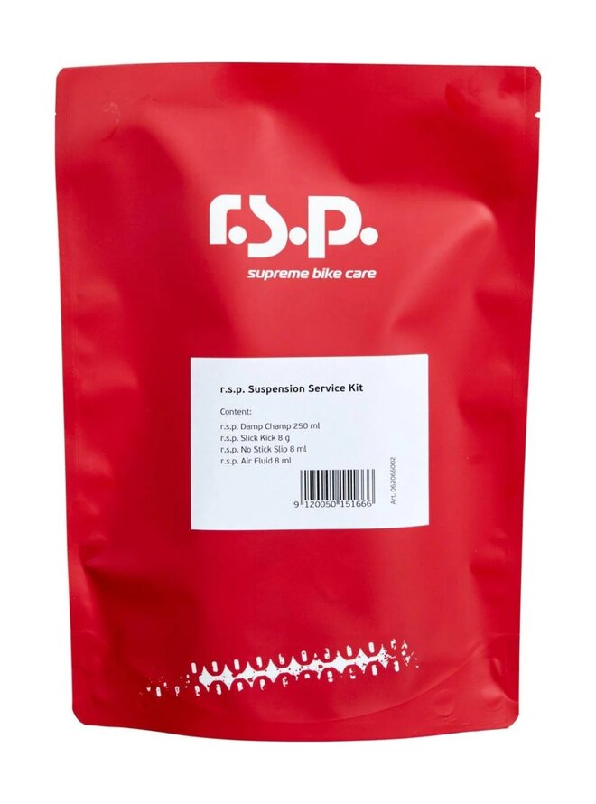 RSP Suspension Service Kit 2.5wt je servisní sada pro odpružení (vidlice a tlumiče), která obsahuje olej Damp Champ 250ml, mazivo Slick Kick (8g), aditivum No Stick Slip (8ml) a mazivo Air Fluid (8ml), určené ke snížení tření, pěnění a zajištění hladkého chodu odpružení.Detaily