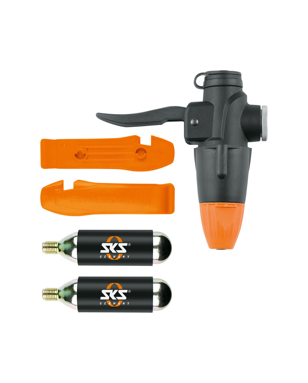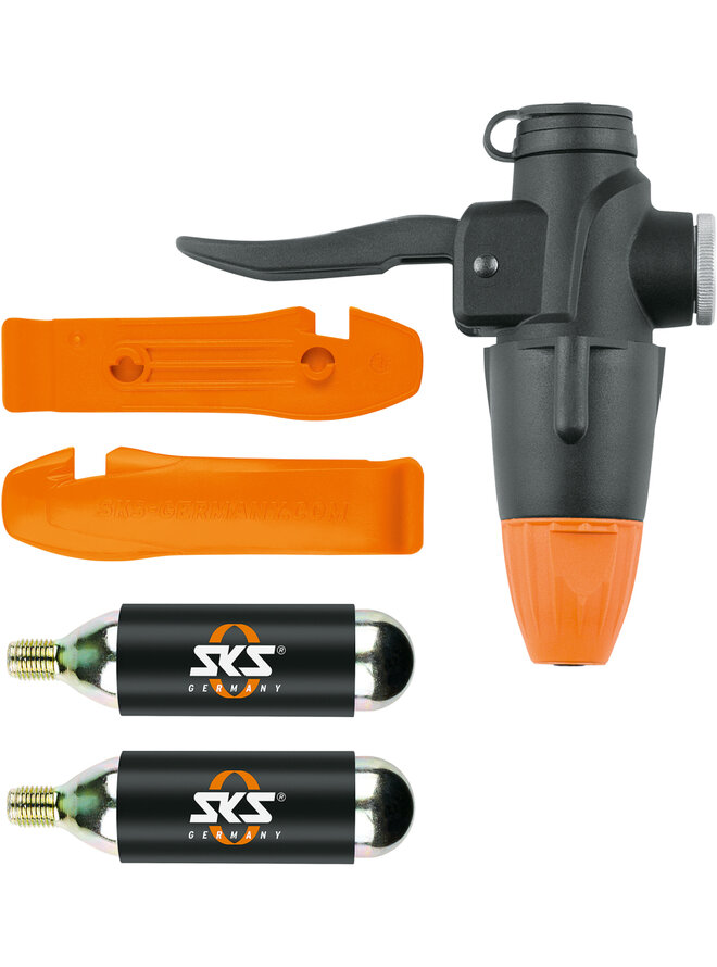 Sada pro huštění bezdušových pneumatik. Koncový uzávěr pumpy, na kterém je namontována bombička CO2 pro rychlé usazení pláště.