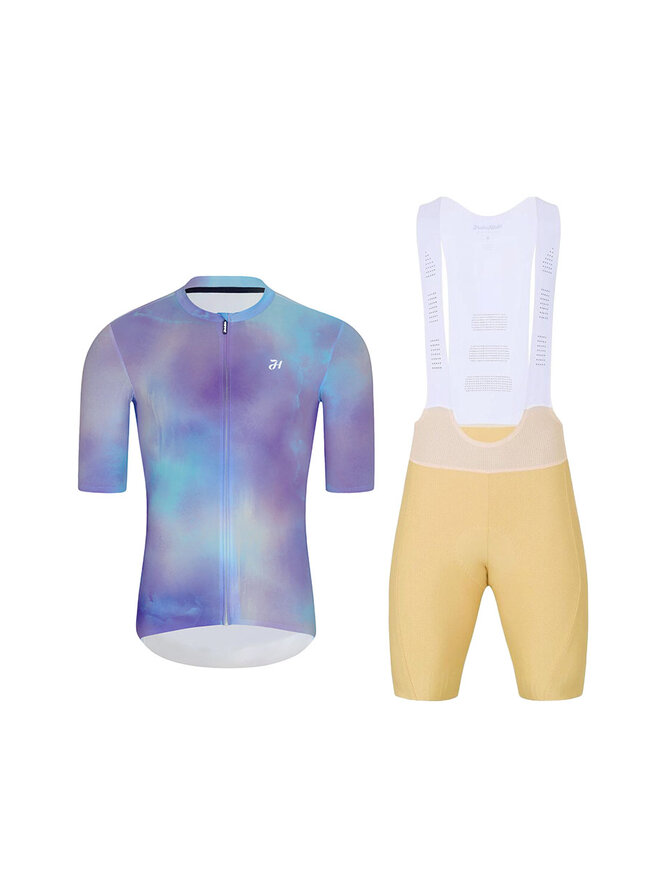 Cyklistický krátký dres a krátké kalhoty - COSMA - béžová/světle modrá/fialová