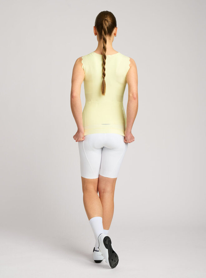 Cyklistický dres bez rukávů s dokonalým obloukovým lemováním, který přináší full glam i do cyklistických outfitů. Hrubší vlnková ramínka a čtvercový výstřih lichotí proporcím ramen i každému typu dekoltu. Nechybí mu ani vybavení, které se od kvalitního dresu očekává. Celoplošný přední zip s ochranným překrytím krku. Trojitá kapsa s bezpečnostní kapsou na zip. Bezešvý lem s protiskluzovým potiskem v zadní části dresu.