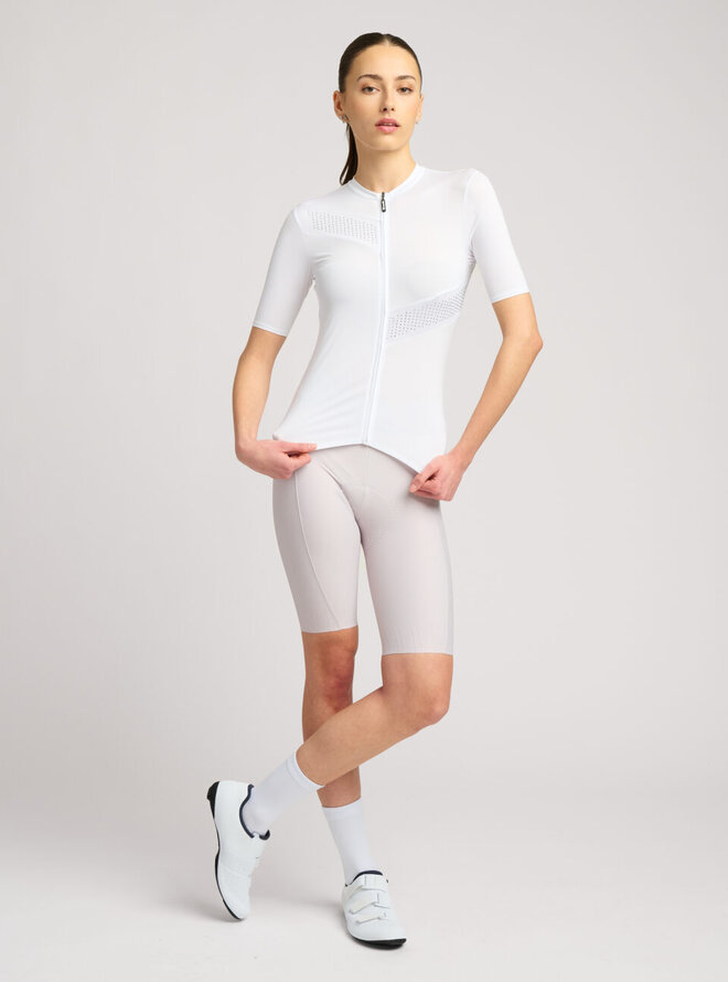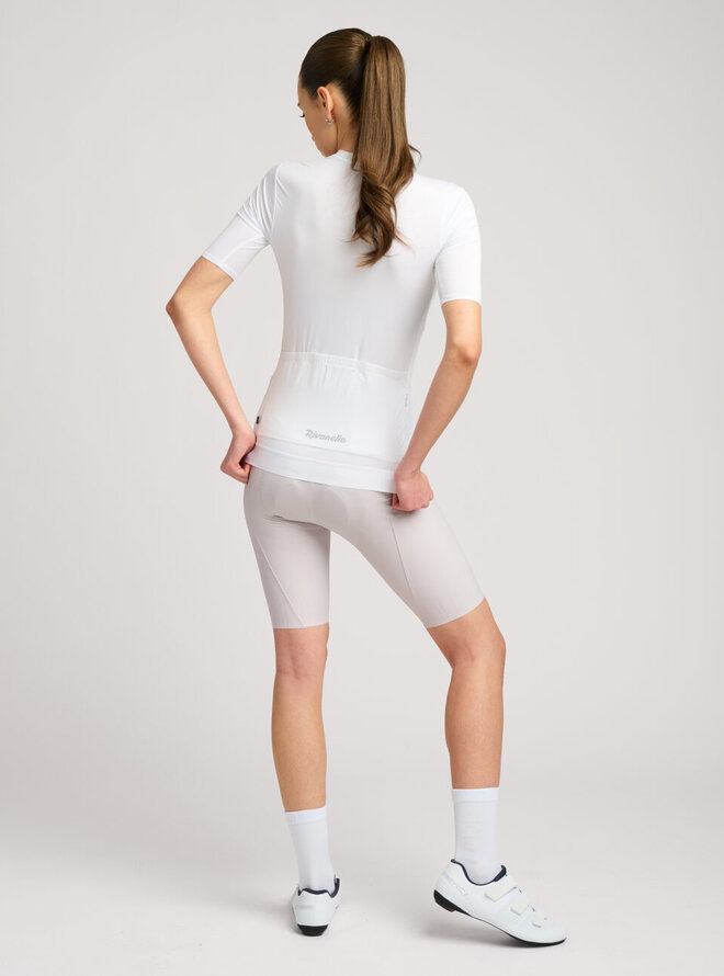 Rivanelle Crystelle je skutečným šperkem, který si můžeš vzít na kolo. Na první pohled minimalistický design se při pohybu odhaluje v detailech. Drobné třpytivé akcenty které se tón v tónu třpytí s dresem. Kamínky jsou precizně vsazeny v šikmých liniích, což vnáší do designu sportovní nádech. Lehká, vysoce kvalitní tkanina je velmi příjemná na tělo a také mimořádně vzdušná. Díky dobré elasticitě se přizpůsobí každé postavě a zároveň uhlazuje její kontury nebo nedostatky. Dres je plný praktických funkcí a každý detail je navržen s ohledem na vaše pohodlí. Celoplošný přední zip s ochranným překrytím krku. Trojitá kapsa s bezpečnostní kapsou na zip. Bezešvý lem s protiskluzovým potiskem v zadní části dresu. Pro cyklistky, které milují minimalismus, ale vědí, že na detailu záleží.Detaily