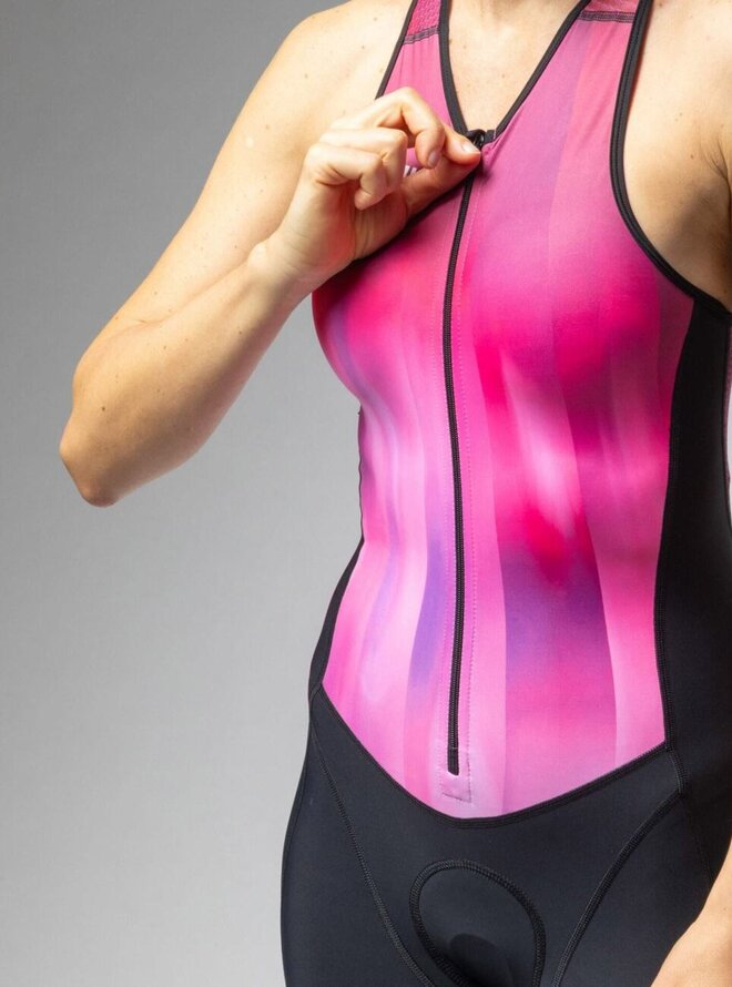 Bezrukávová triatlonová kombinéza "Skinsuit" Crazy Lady je navržená pro krátké intenzivní plavecké tréninky a rychlé úseky. Anatomický střih, odlehčená konstrukce a ultralehké materiály s hydrofobní úpravou odpuzují vodu bez jejího nasákání, čímž snižují odpor i hmotnost. Tenký materiál navíc zajišťuje přiléhavý „second-skin“ efekt pro maximální efektivitu ve vodě.- Závodní střih