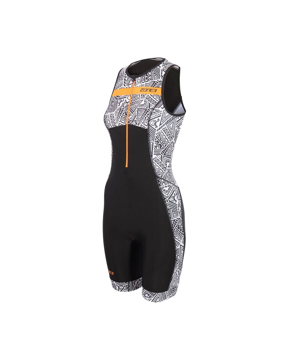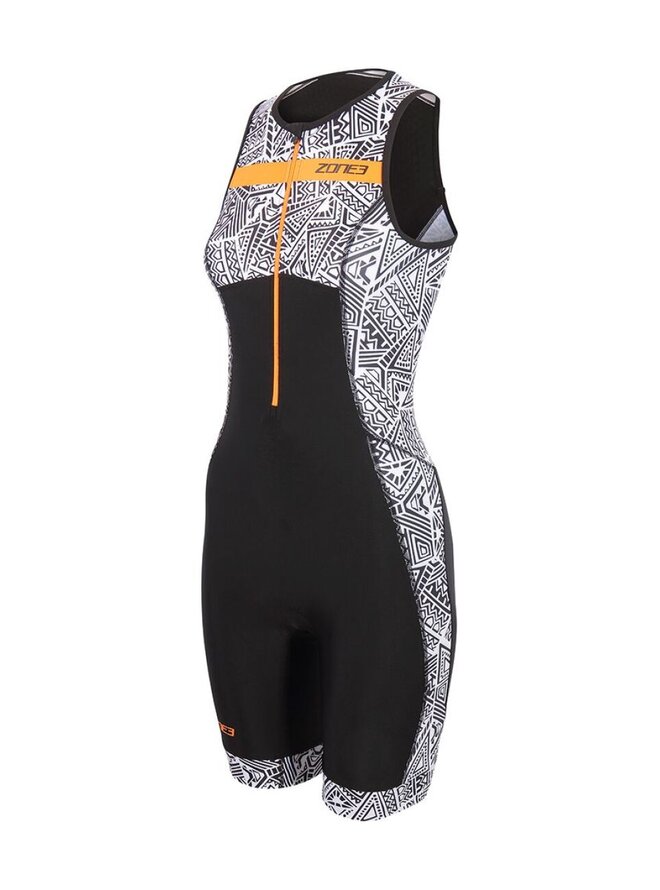 Dámská triatlonka Zone3 Activate+ Kona Speed Sleeveless Trisuit v moderním černobílém designu s oranžovými detaily je všestranná a výkonnostně laděná kombinéza určená pro triatlonisty, kteří chtějí maximální volnost pohybu a prodyšnost při každé disciplíně. Tento model kombinuje elegantní sportovní vzhled se špičkovou funkčností materiálů, které účinně odvádějí pot a rychle schnou, což oceníte zejména při náročných trénincích a závodech v teplejším počasí. Svršek a nohavice jsou vyrobeny z vysoce elastické tkaniny Lycra Sport, která zajišťuje pohodlné nošení, dobré krytí a podporu bez nepříjemného tahání nebo lesku. Zádová část je doplněna lehkým a vysoce elastickým "wafle" panelem, který maximalizuje prodyšnost a pohodlí při běhu nebo cyklistice. Detaily jako přední zip umožňují snadnou regulaci ventilace během výkonu. Tri-suit je navržen s vložkou Tri-lite pro zvýšený komfort při jízdě na kole bez omezení při běhu nebo plavání a silikonovými úchyty na nohách, které udrží oblek na místě i při dynamických pohybech. Praktická elastická zadní kapsa poskytuje úložný prostor pro jídlo nebo drobné osobní věci během závodu. Díky své konstrukci bez rukávů je tato triko ideální pro teplejší období, zejména jaro a léto, kdy je důležité zachovat nízkou hmotnost a maximální proudění vzduchu bez kompromisů v oblasti aerodynamiky nebo pohodlí.Detaily