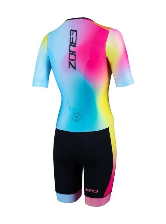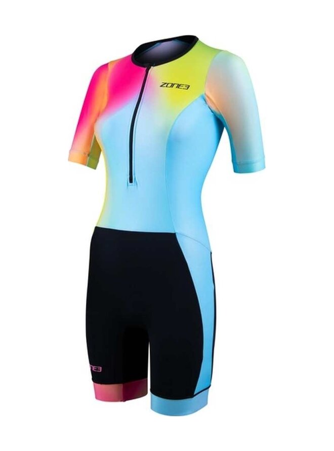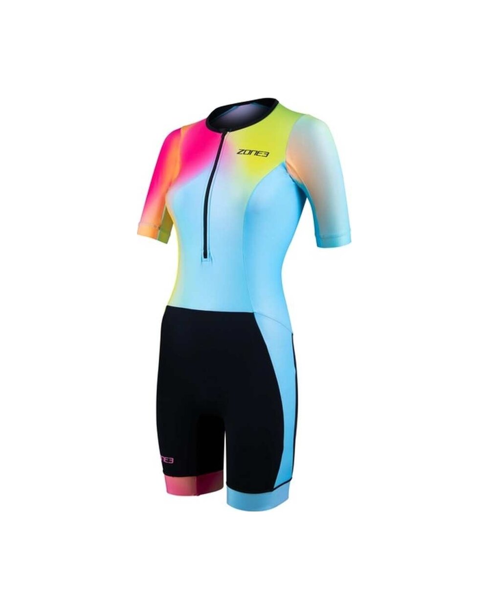 Dámský triatlonový oblek Zone3 Activate+ Short Sleeve Trisuit je výkonnostně laděný triatlonový oblek, který kombinuje pohodlí, funkčnost a moderní styl pro tréninkové i závodní dny. Tento model představuje vylepšenou verzi oblíbené řady Activate+ s důrazem na prodyšnost, rychlé schnutí a optimální odvod vlhkosti, díky kterému si zachováte suchý a pohodlný pocit při každé disciplíně. Je vyrobena z vysoce výkonných recyklovaných materiálů, které poskytují flexibilitu, odolnost a velký rozsah pohybu bez omezení. Zadní díl s panelem z recyklované síťoviny zlepšuje proudění vzduchu a odvádí pot, což oceníte zejména při náročnějších trénincích nebo v teplejším počasí. Díky krátkým rukávům nabízí model lepší krytí a aerodynamiku bez kompromisů. Tri-suit je vybaven promyšleně umístěnou Tri-Lite vložkou, která poskytuje pohodlí během cyklistické části bez omezení při běhu a plavání, a silikonovými gripy na nohách, které drží kalhoty pevně na místě bez nežádoucích pohybů. Elastický přední zip umožňuje snadné oblékání a dodatečné odvětrávání podle potřeby, zadní elastická kapsa zase poskytuje praktický úložný prostor pro energetické gely nebo drobnosti. Díky kombinaci funkčních materiálů, ergonomického střihu a technických detailů je tato trička ideální volbou pro triatlonisty, kteří hledají optimální rovnováhu mezi výkonem, pohodlím a udržitelností.Detaily