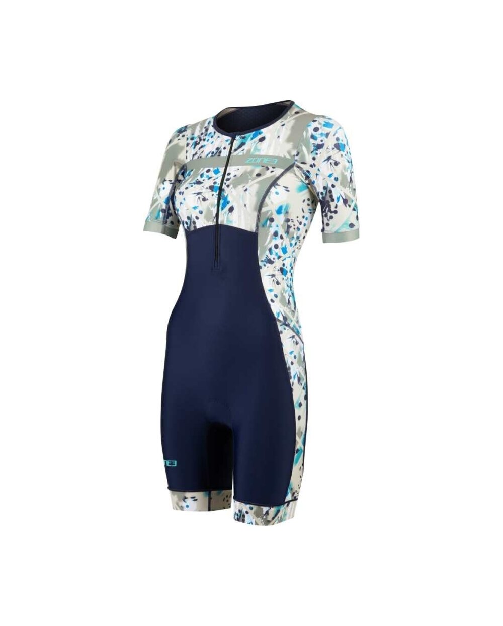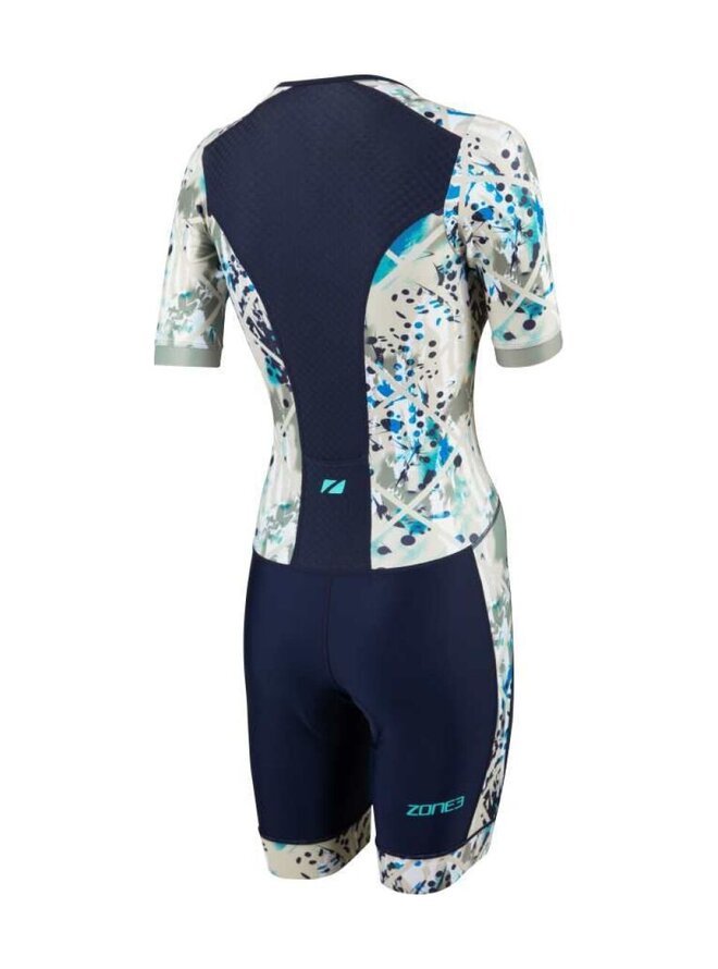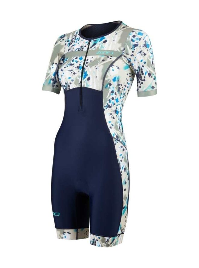 Dámský triatlonový oblek Zone3 Activate+ s krátkým rukávem je technický triatlonový oblek navržený pro atletky, které oceňují kombinaci výkonu, pohodlí a udržitelnosti. Tento model vychází z oblíbené řady Activate+, která nabízí kvalitní materiály, funkční detaily a moderní design vhodný pro tréninkové i závodní dny. Triko je vyrobeno ze 100% recyklovaných funkčních tkanin, které zajišťují vysokou elasticitu, dobrý odvod vlhkosti a rychlé schnutí od prvního okamžiku. Zadní strana obsahuje panel z recyklované síťoviny, který zlepšuje prodyšnost a udržuje tělo v pohodě i při velké zátěži. Ergonomicky umístěná stélka Tri-Lite poskytuje pohodlí během cyklistické části závodu, aniž by omezovala běh nebo plavání, a recyklované silikonové gripy UFO udrží kalhoty bezpečně na místě bez nežádoucího pohybu. Oblek je vybaven předním zipem pro snadné oblékání a účinnější ventilaci a zadní elastickou kapsou na energetické gely nebo drobné osobní věci. Stylová kontrastní barva Sand Storm/Navy-Sand dodává kombinaci moderní sportovní vzhled a je ideální pro triatlonisty, kteří hledají spolehlivý výkon a pohodlí v každé disciplíně.Detaily