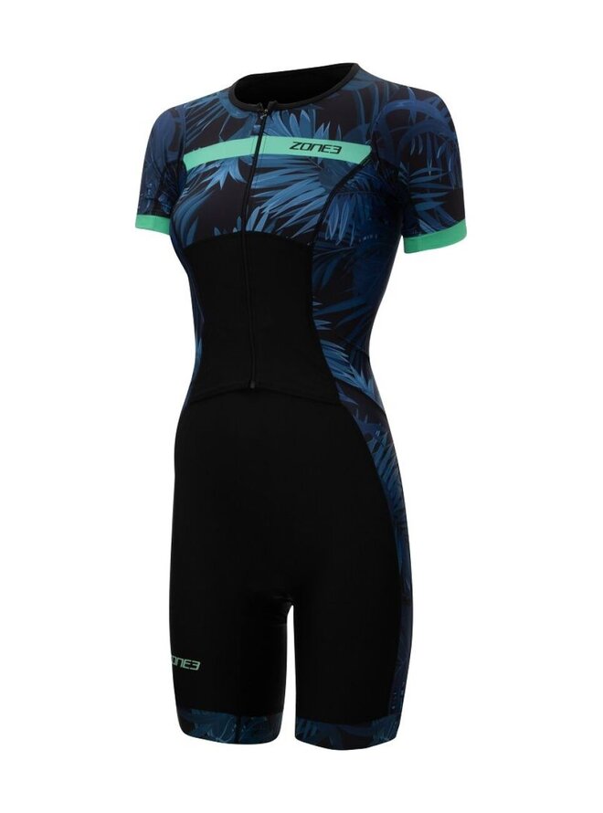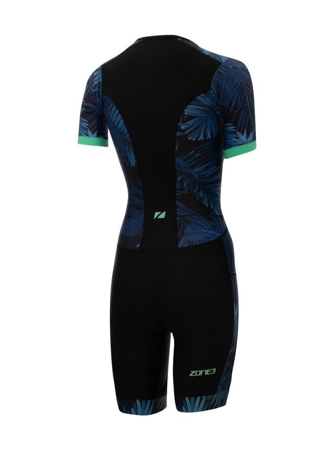 Dámská triko s krátkým rukávem Zone3 Activate+ Tropical Palm je navrženo tak, aby poskytovalo vysokou prodyšnost, pohodlí a aerodynamický profil během tréninkových a závodních dnů. Řada Activate+ navazuje na úspěch původní řady a přináší vylepšené technické materiály a moderní tištěný vzhled, který vám dodá jistotu na startu i během závodu. Oblek je vyroben z vysoce elastických a prodyšných tkanin — přední panely z vysoce výkonné tkaniny Lycra Sport zajišťují optimální přizpůsobení a pokrytí, zatímco zadní část s ultralehkým „waflovým“ panelem podporuje maximální ventilaci a pohodlí po celou dobu výkonu. Krátké rukávy nabízejí lepší krytí a aerodynamické výhody bez omezení pohybu. Triatlonová kombinéza má ergonomicky umístěnou vložku Tri‑Lite, která zvyšuje komfort během cyklistické části bez omezení při běhu nebo plavání. Přední zip umožňuje snadné oblékání a efektivní regulaci ventilace podle potřeby, zadní elastická kapsa nabízí praktický prostor pro energetické gely nebo drobné osobní věci. Silikonové UFO gripy drží kalhoty pevně na svém místě bez nežádoucích pohybů a ploché švy minimalizují tření pro větší pohodlí během závodu.Detaily