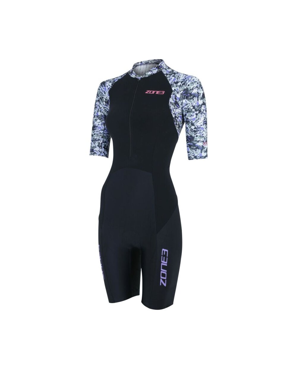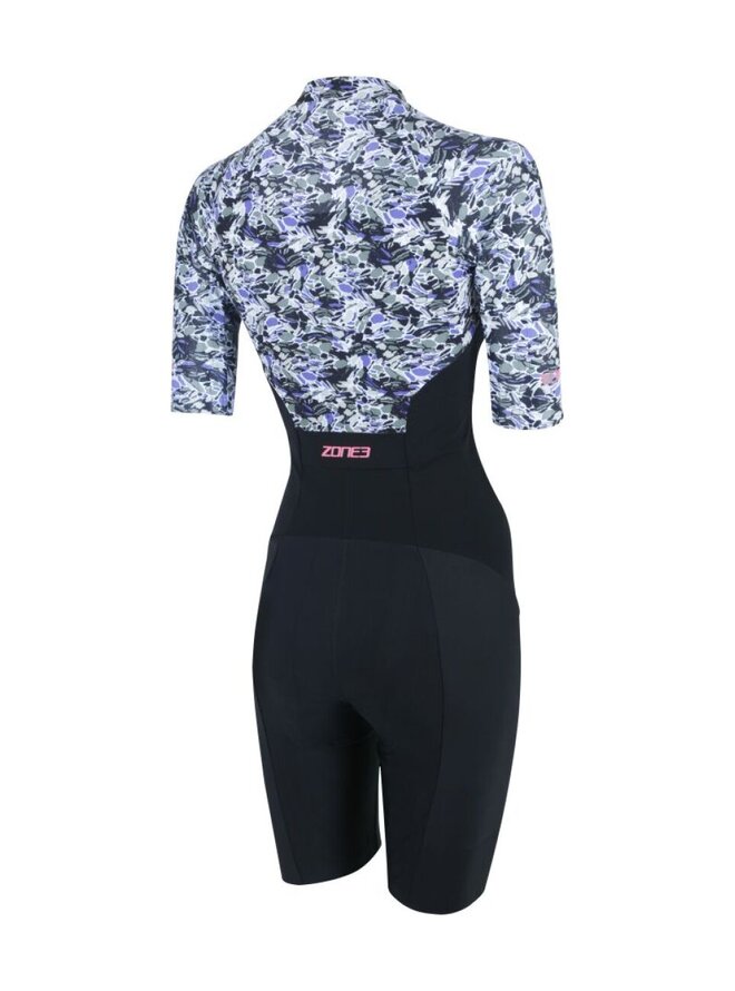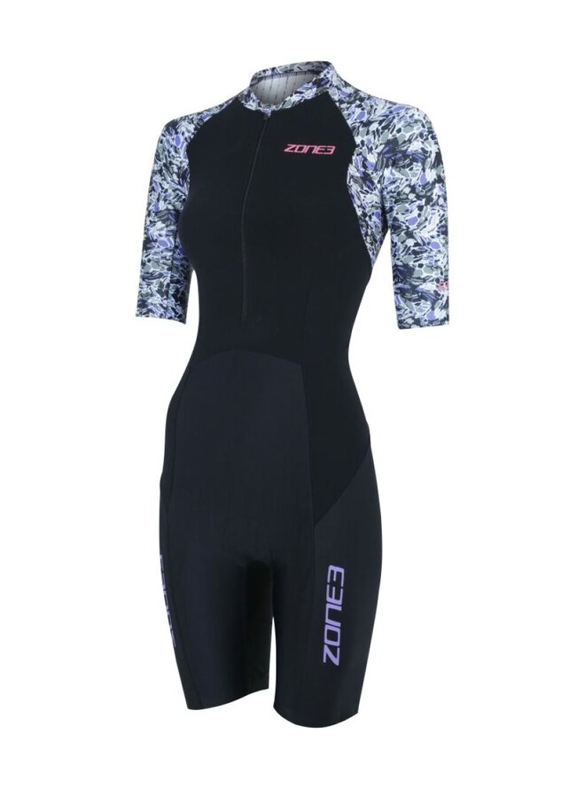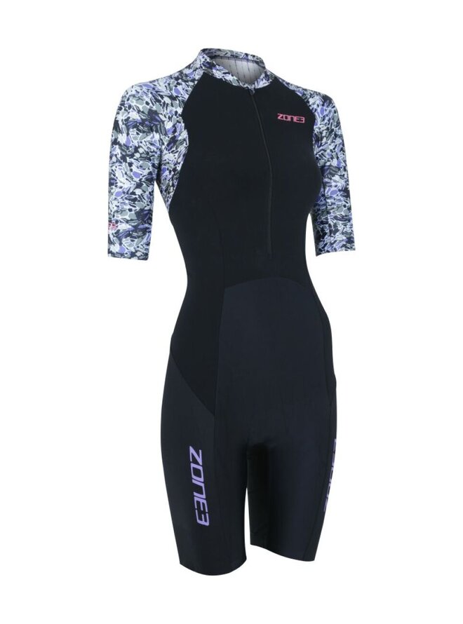 Zone3 Lava Short Sleeve Trisuit je prémiový dámský triatlonový oblek určený pro náročné závody a delší tréninky. Tento model pochází z oceňované kolekce Lava, která je výsledkem dlouhodobého vývoje a testování v aerodynamickém tunelu i mezi profesionálními sportovci. Trisuit Lava kombinuje pokročilé aerodynamické panely, vodoodpudivé úpravy a technické materiály, které společně zlepšují výkon ve všech třech disciplínách – plavání, cyklistice a běhu. Použité materiály jsou lehké, prodyšné a rychleschnoucí, přičemž hlavní panely pro maximální pohodlí a výkon využívají prémiovou tkaninu Aeroforce Soft‑Touch, která je měkká na dotek, skvěle odvádí pot a zároveň má voděodpudivou nano vrstvu snižující odpor při vstupu do vody i venku. Texturovaný materiál AERO-STRIPE na rukávech a horní části zad pomáhá zlepšit aerodynamiku při vyšších rychlostech, což je důležité zejména během cyklistické části závodu. Ergonomický střih a panelový design přizpůsobený ženské anatomii zajišťuje pohodlné nošení bez omezení pohybu. Oblek je vybaven integrovanými úchyty nohou s prémiovými „zlatými“ závity pro stabilní držení nohou bez posunu, zatímco ploché švy a tepelné vázání na rukávech minimalizují tření pokožky a zvyšují pohodlí během závodu. Model Lava má velkou zadní kapsu na nutriční gely nebo drobnosti, celopřední zip pro snadné oblékání a regulaci ventilace a pohodlnou stélku Cytech Tri Comp, která je určena pro delší triatlonové tratě bez kompromisů v pohodlí.Detaily